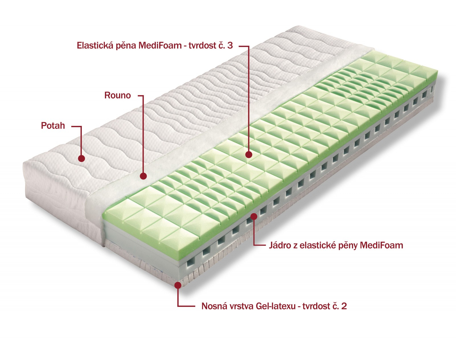 Profilovaná matrace kombinovaná s elastickou pěnou a Gel-Latexem. Gel-Latex je chladivý, měkký ale zachovává si svou elasticitu a pružnost. Jádro matrace a druhá nosná vrstva je složena z tvrzené pěny MediFoam. Střed matrace je provzdušněn příčnými průřezy tak, aby byla dokonale zajištěna cirkulace vzduchu. Matrace je vhodná na všechny typy roštů. Matrace lze vybrat v potahu ÚPLET nebo ALOE VERA. V objednávce prosím uveďte Vámi vybraný potah. Výška matrace včetně potahu 21 cm. Matrace do hmotnosti 130 kg. K této matraci nabízíme jako dárek zdarma 1x polštář Lukáš.