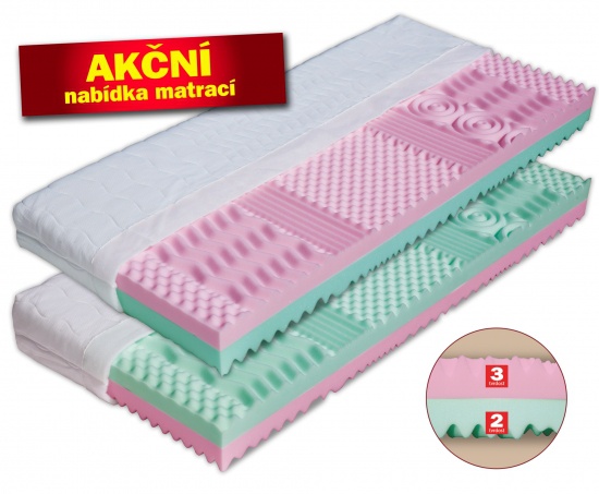 Sedmizónová matrace s volbou dvojí tvrdosti je složena ze dvou vysoce kvalitních elastických pěn tvarovaných do masážních nopů. Nopy zabezpečují prokrvení pokožky a uvolnění svalů během spánku a nadzvedávají potah, čímž dochází k lepšímu provzdušnění matrace. Matrace se vyznačuje výbornou elasticitou a odolností. Je určena pro širokou škálu uživatelů a je vhodná na všechny typy roštů. Matrace lze vybrat v potahu ÚPLET nebo ALOE VERA. V objednávce prosím uveďte Vámi vybraný potah. Výška matrace včetně potahu 17 cm. Matrace do hmotnosti 120 kg.