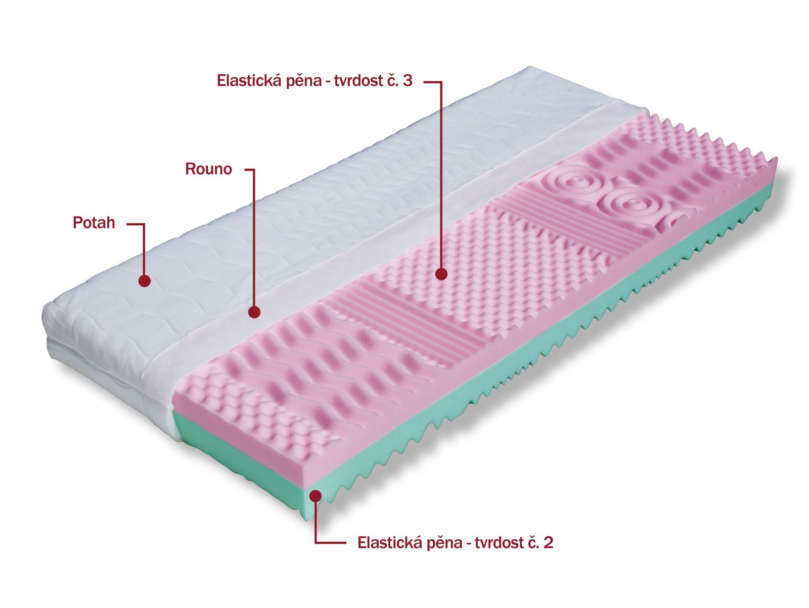 Sedmizónová matrace s volbou dvojí tvrdosti je složena ze dvou vysoce kvalitních elastických pěn tvarovaných do masážních nopů. Nopy zabezpečují prokrvení pokožky a uvolnění svalů během spánku a nadzvedávají potah, čímž dochází k lepšímu provzdušnění matrace. Matrace se vyznačuje výbornou elasticitou a odolností. Je určena pro širokou škálu uživatelů a je vhodná na všechny typy roštů.Matrace je vhodná na všechny typy námi nabízených roštů.Matrace lze vybrat v potahu SILVERGUARD,MEDICOTT,LYOCELL - antibakteriální potah nebo LEVANDULE - s relaxačními účinky. V objednávce prosím uveďte Vámi vybraný potah. Výška matrace včetně potahu 17 cm. Matrace do hmotnosti 120 kg.