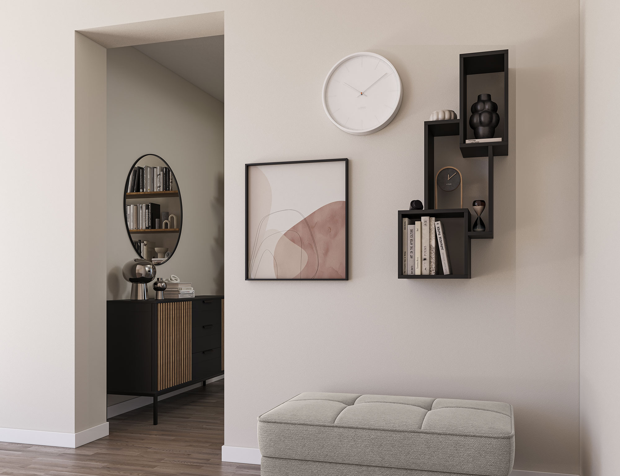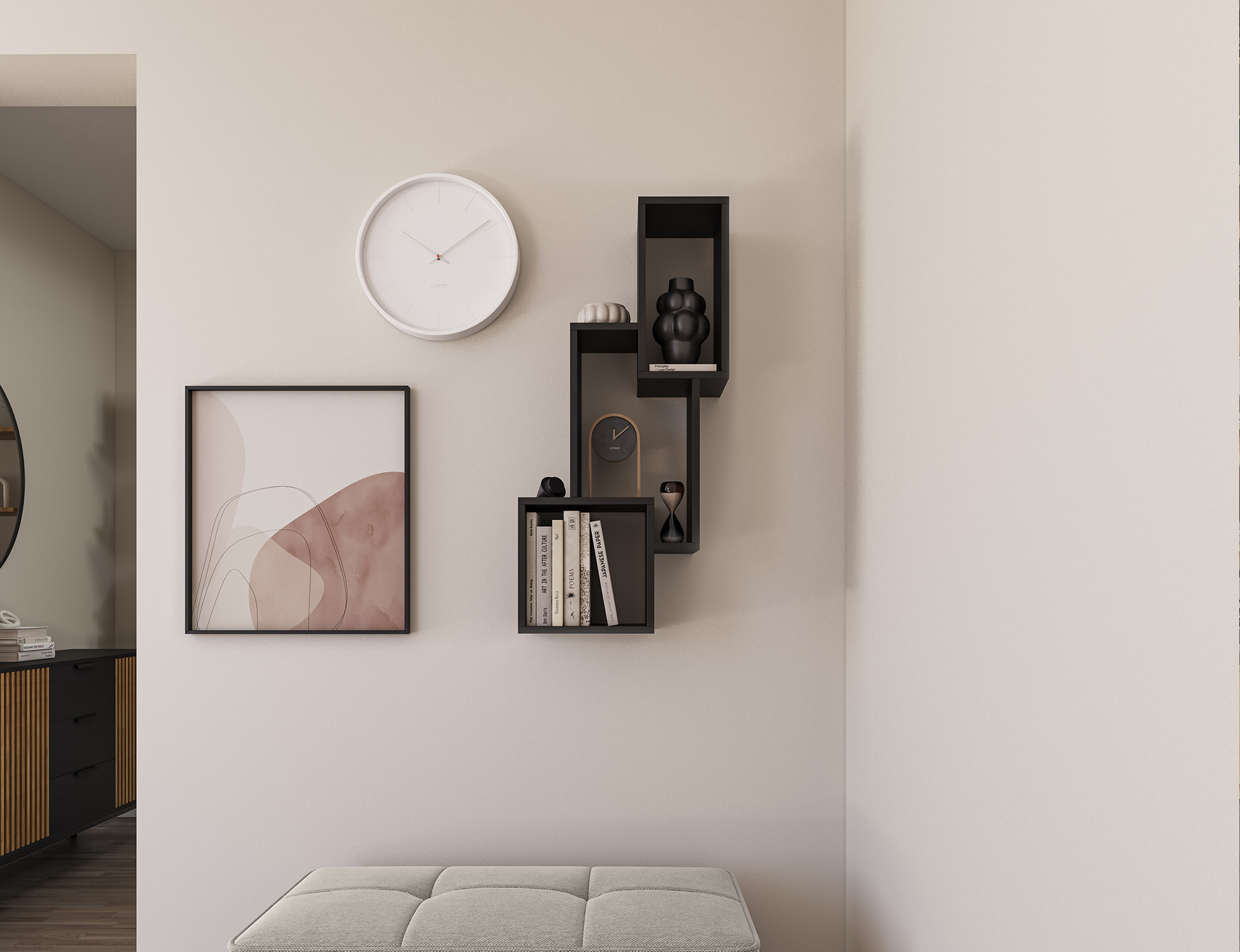 The Alitty hanging shelf is a stylish and functional interior feature, consisting of three smaller shelves of varying sizes. The total dimensions of the set are 96x46x25 cm. Each shelf differs in size, allowing for an attractive arrangement of items of various dimensions, creating an interesting visual display on the wall. This shelf is an ideal solution for the living room, bedroom, office, or hallway. With its modern design and versatile dimensions, the Alitty shelf complements various interior styles, adding both character and functionality. It's perfect for holding books, decorations, plants, and other small items you want to keep within reach or showcase.