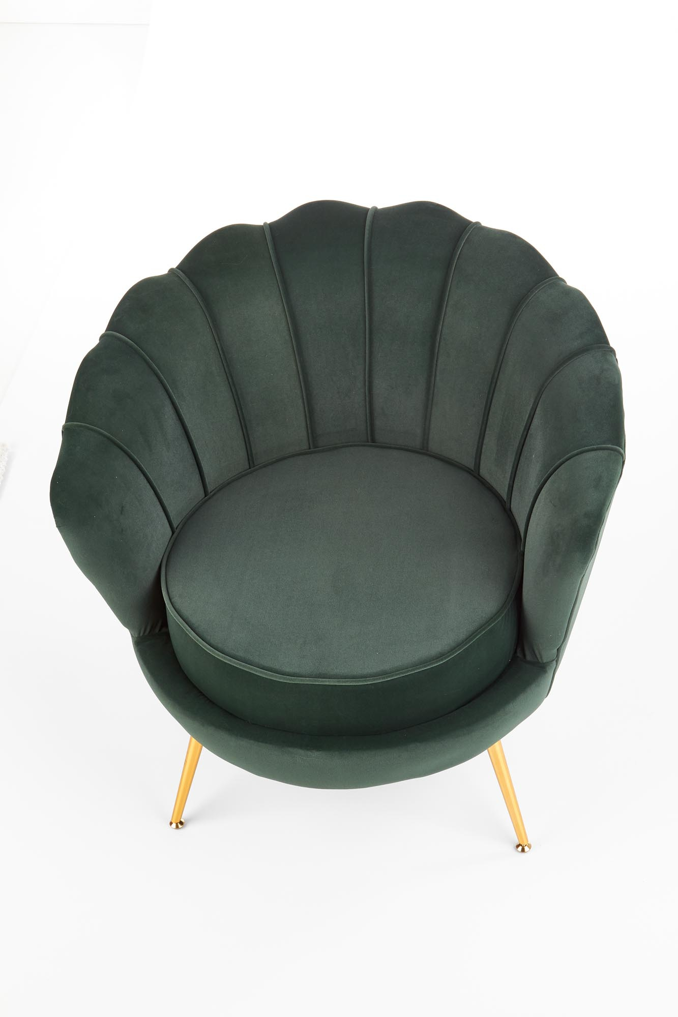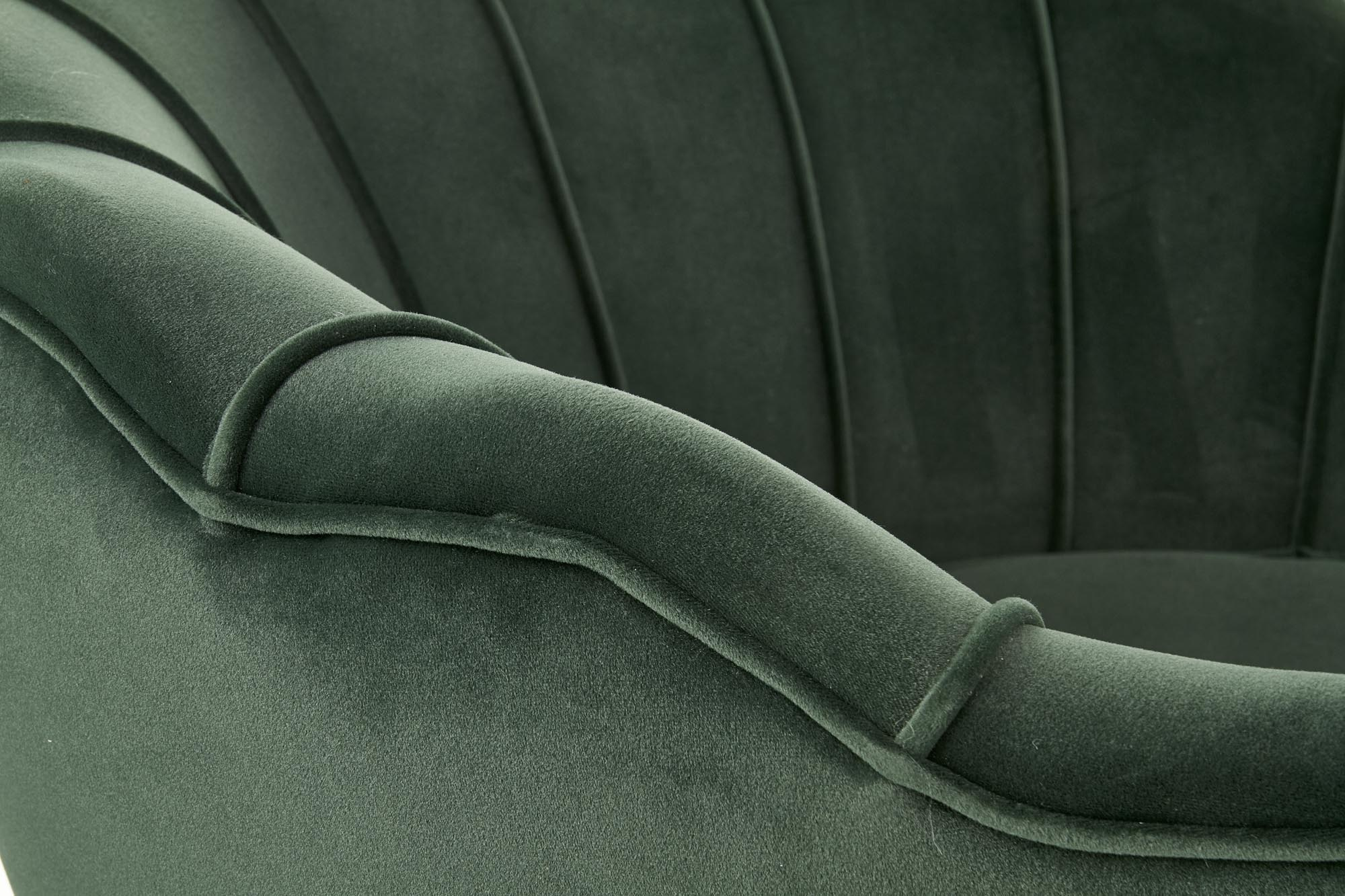 Luxusní křeslo v látkovém provedení v barvě tmavě zelená doplněné o nožky z chromované oceli v barvě zlatá.