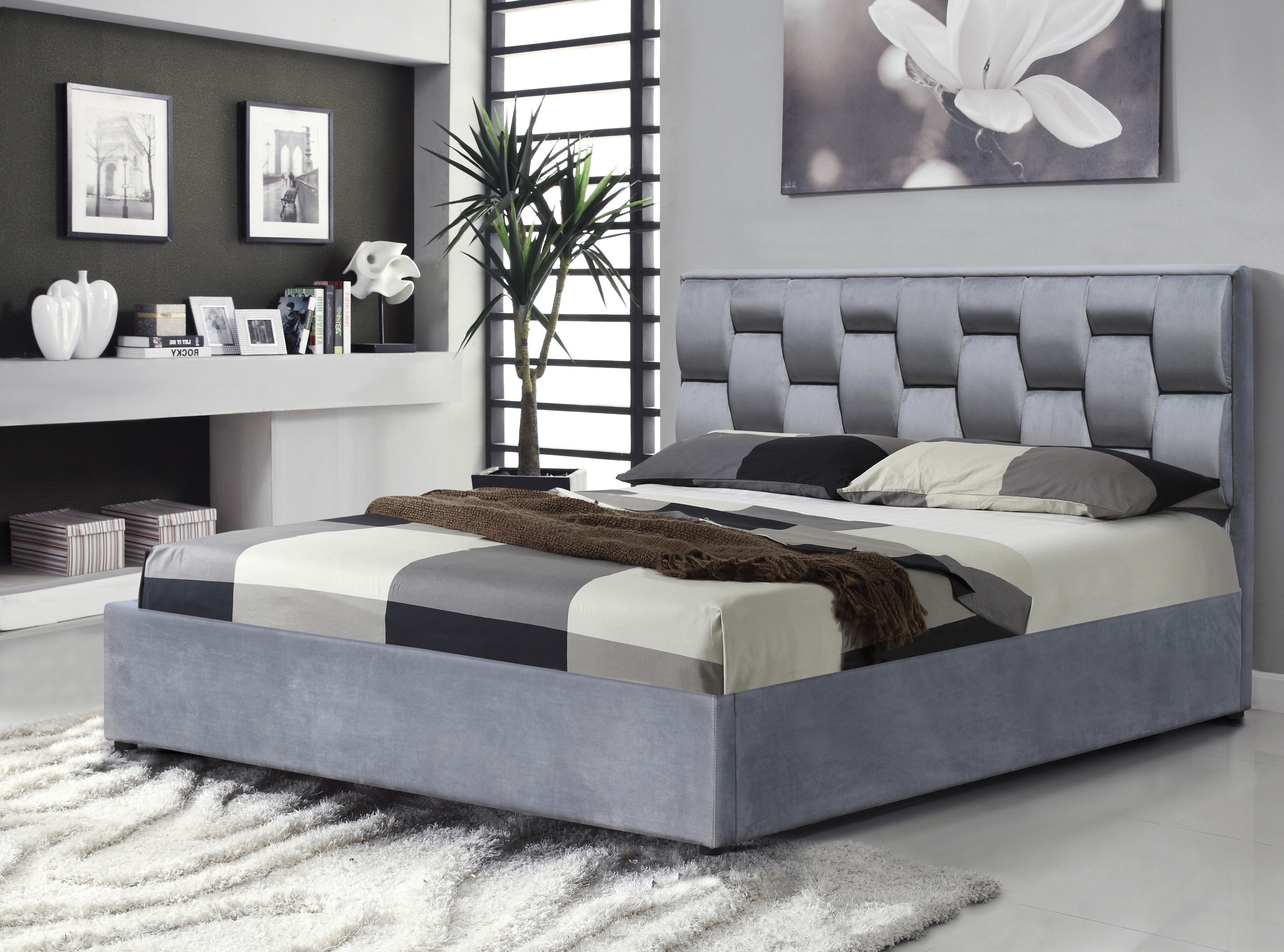 Postel je vyrobena z masivního dřeva, které je potaženo sametovou látkou v barevném provedení šedá. Čelo postele je ozdobné prvky v podobě 3D ve stejné barvě jako látka postele. Postel má úložný prostor. Matrace není součástí postele a doporučená matrace Polaris 160.