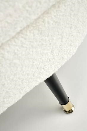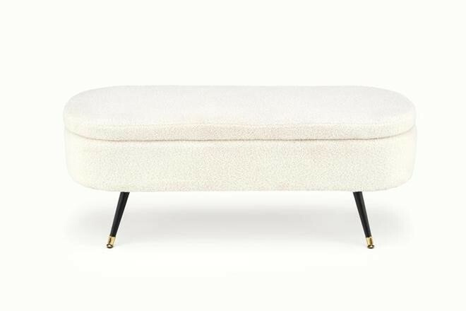 Taburet Aveiro je potažený příjemnou buklé tkaninou, která připomíná ovčí srst v krémové barvě. Předností taburetu je jeho úložný prostor. Ten se skrývá pod víkem (pevně připojeným pístem). Taburet pevně stojí na kovových černých nohách zakončených zlatými násadkami. Zboží dodáváme v demontu.