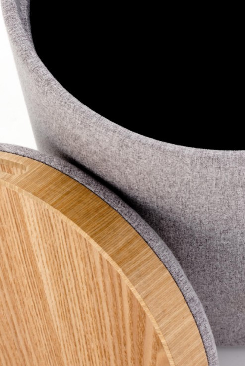 Sestava dvou válcových taburetů. Jsou očalouněné světle šedou látkou. Taburety mají úložný prostor, víko je z dýhované MDF.