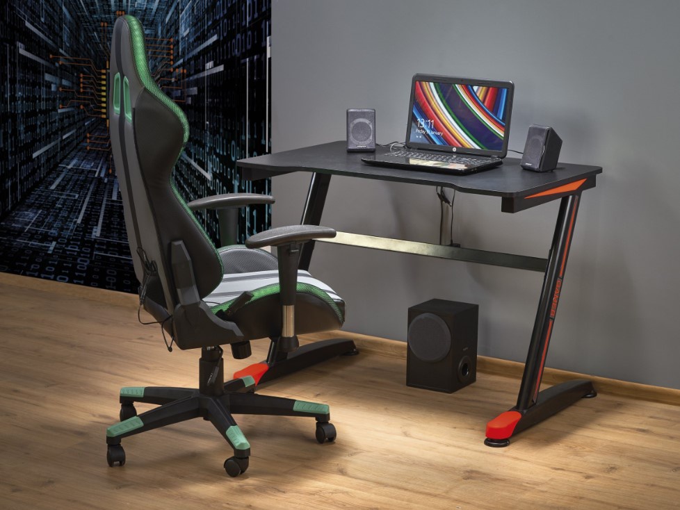 Moderní herní stůl B40 je vyroben: deska z dýhované MDF, nohy z práškované oceli v barvě černo-červené. Má LED osvětlení. Zboží je dodáváno v demontu.