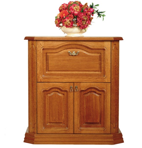 Stylová rustikální komoda je velmi pěkným stylovým prvkem. Nábytek má přední části zhotovené z dubového masívu, boky jsou z dřevotřískové přírodně dýhované desky, horní a spodní deska je vyrobená z lakované MDF, mořené, lakované v barevném provedení č. 3. Celá kolekce má velmi kvalitní a originální zpracovaní, od úchytek až po řezbu ve dřevě. Ve spodní části najdeme dvoudvéřový bar, nad ním zásuvku. Možnost výběru z několika odstínů moření dřeva. Vámi zvolenou variantu moření uveďte v objednávce.