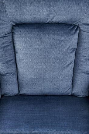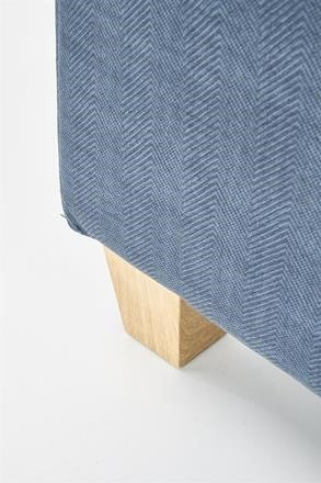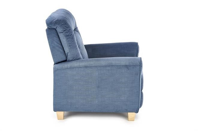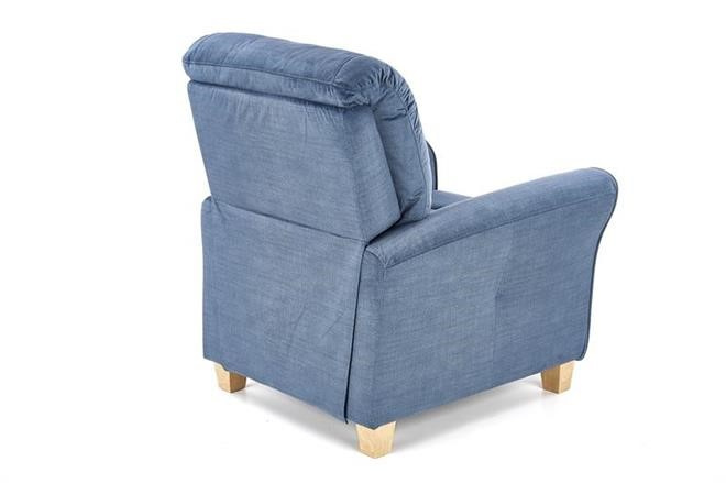 Rozkládací čalouněné křeslo v barvě tmavě modrá, doplněné o nožky z masivního dřeva. Max. nosnost 120