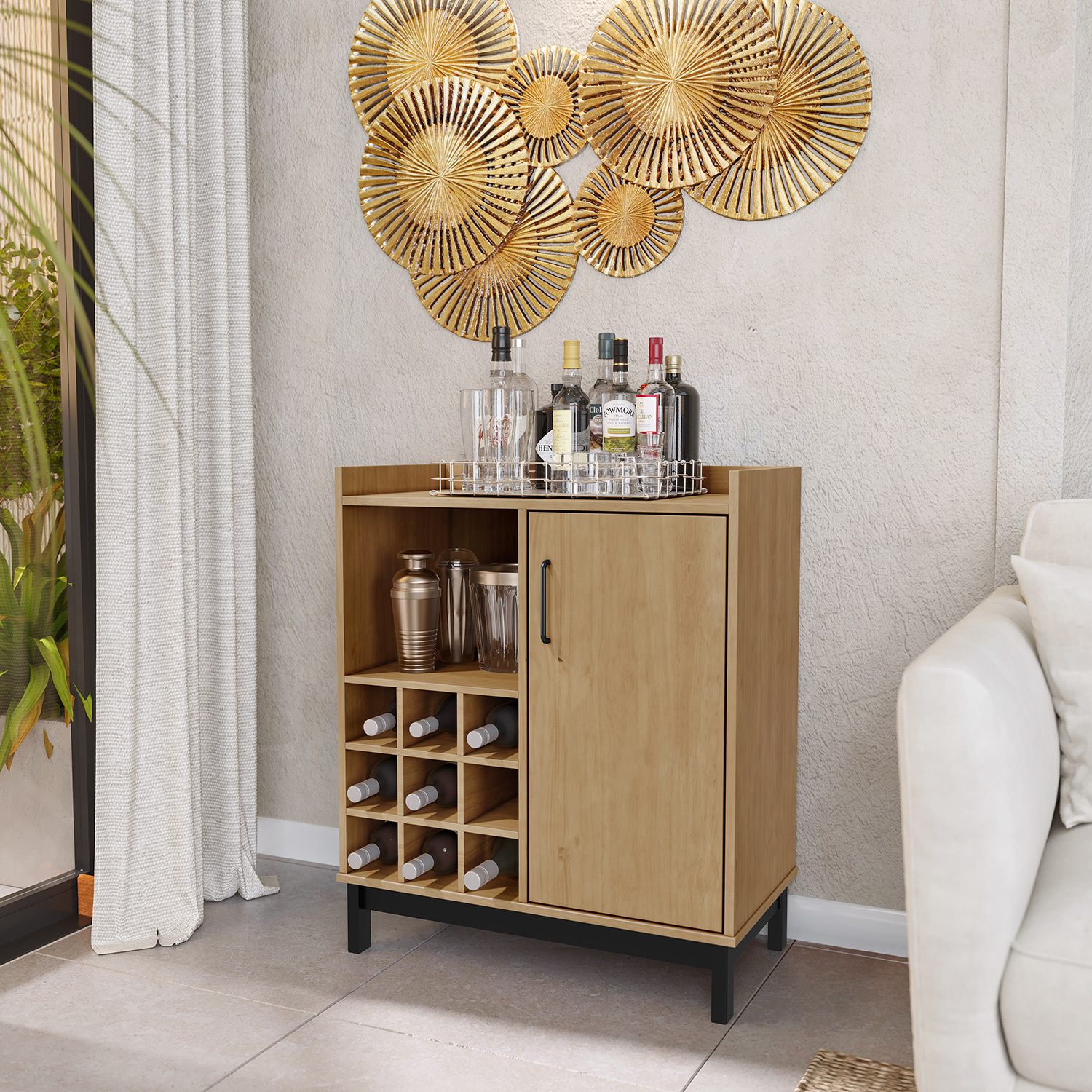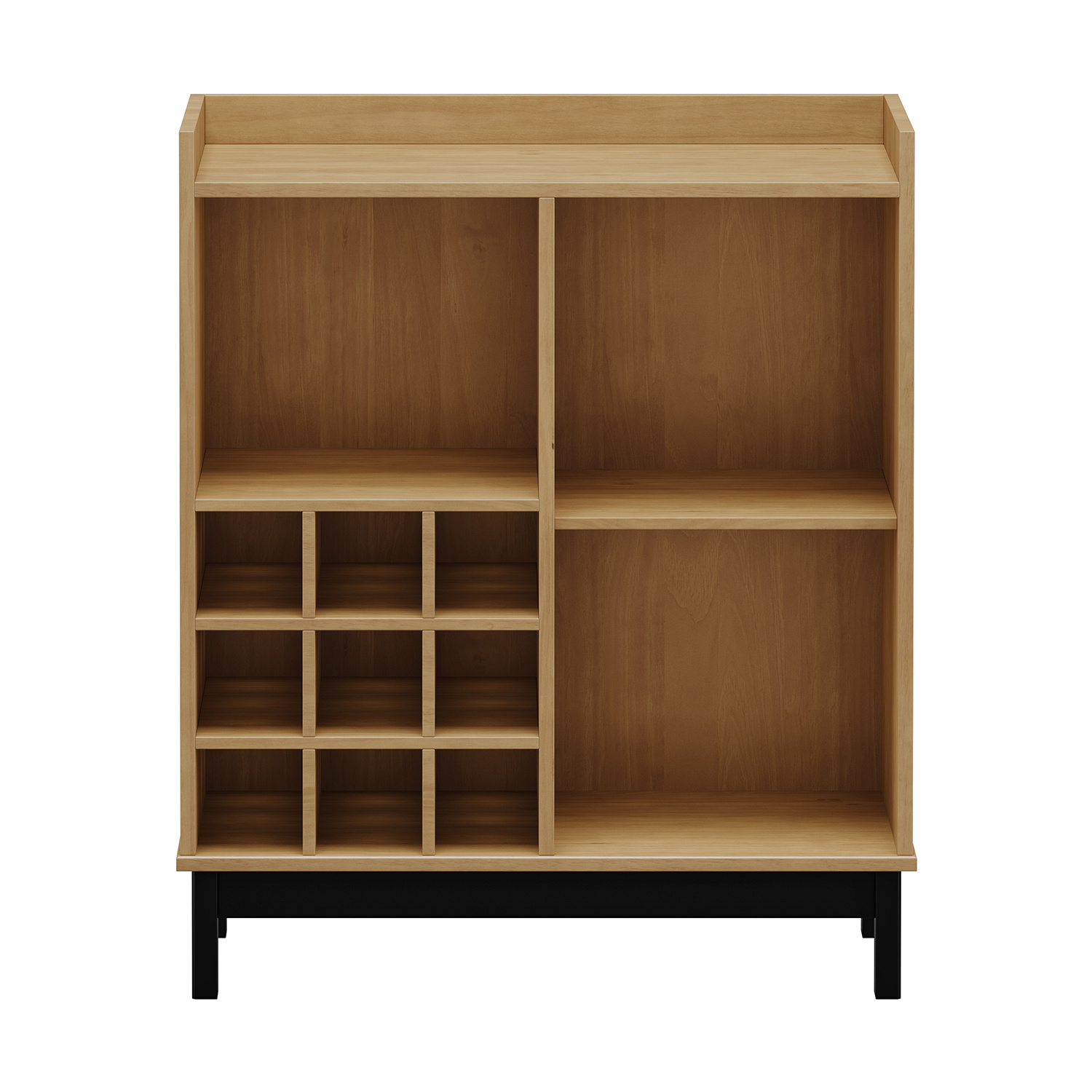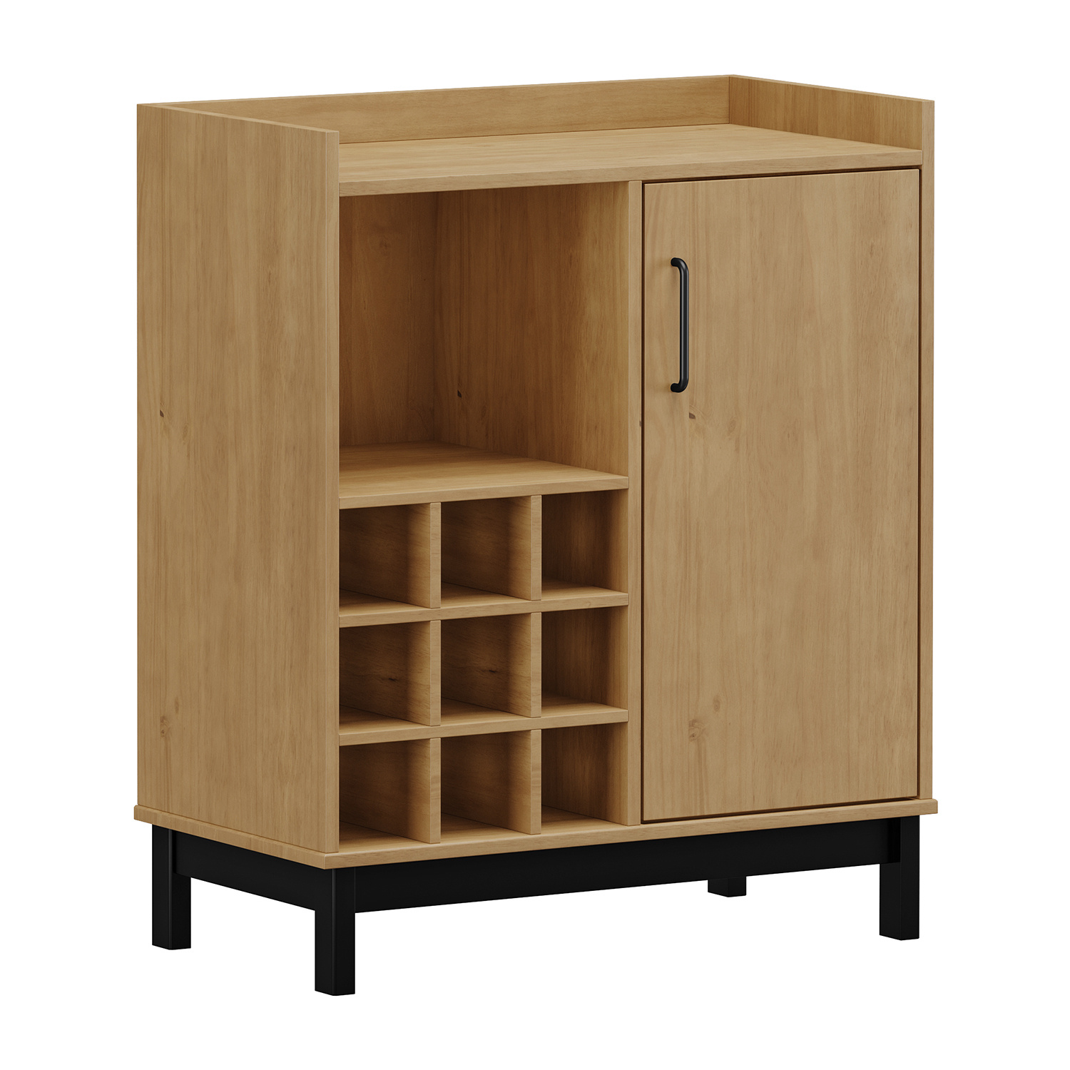 Barová skříňka v barevném provedení buk/ černé nohy. Ve spodní části levé strany prostor k uložení vína, pravá část má 1 dvířka. Zboží dodáváme v demontu.