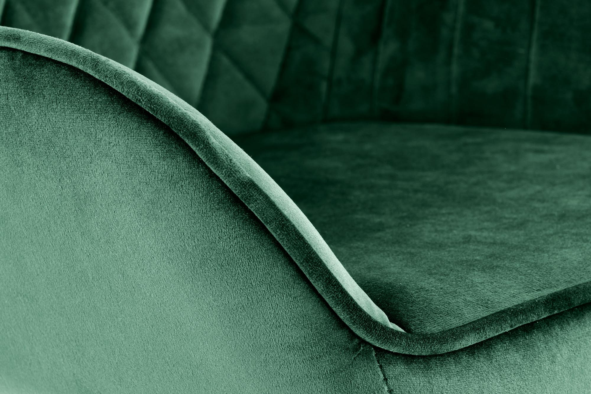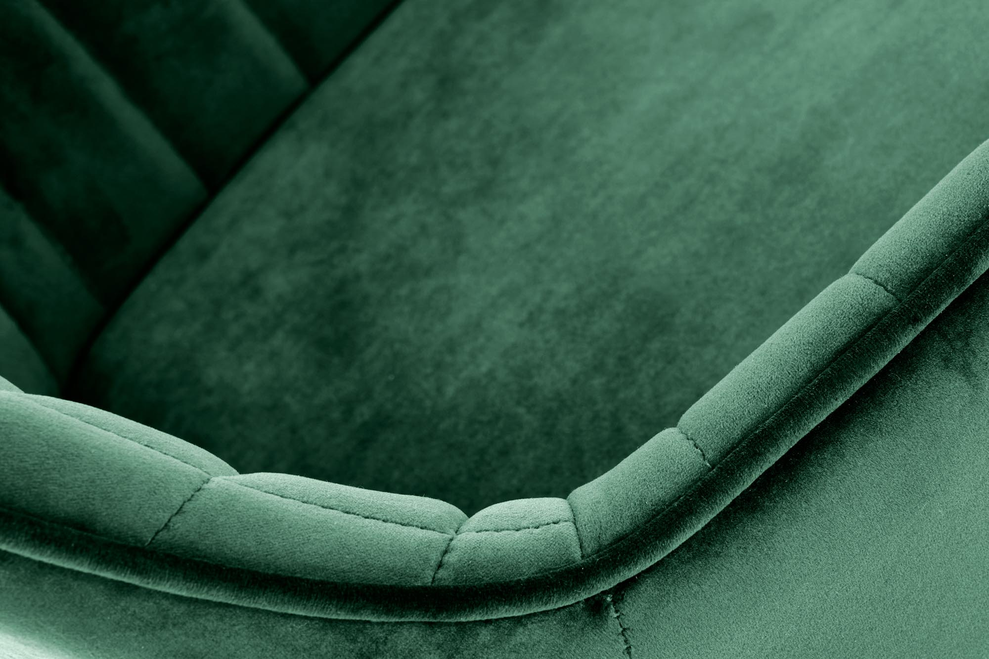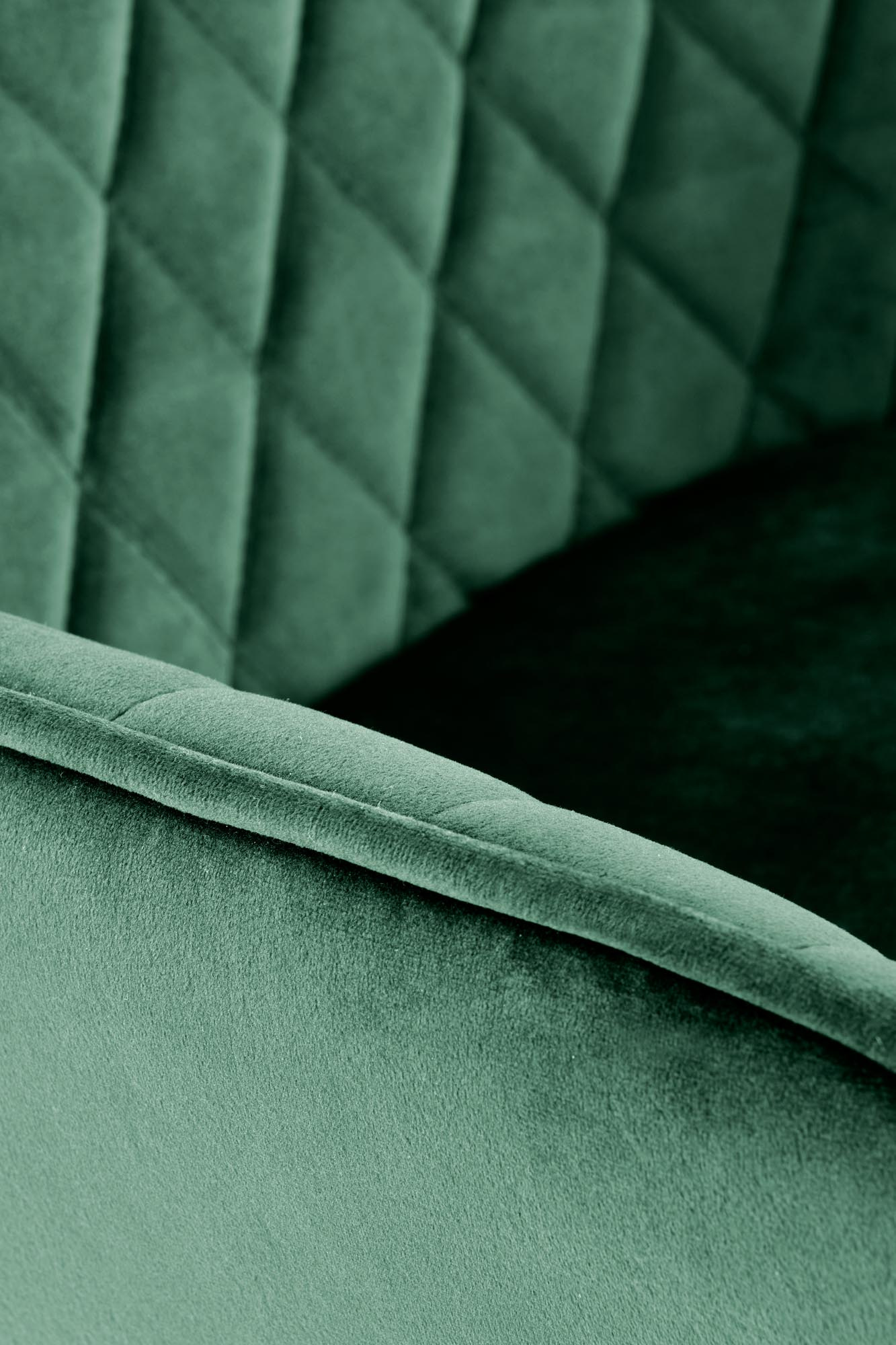 Nohy barové židle jsou vyrobeny z práškované oceli v černé barvě. Jejich součást tvoří pohodlná podnožka na oporu nohou. Sedák a opěrák jsou očalouněny tmavě zeleným sametem.
