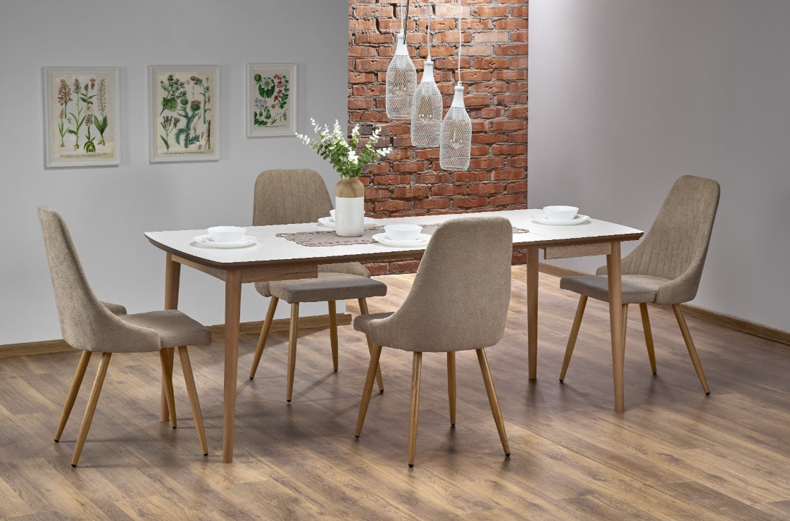 Rozkládací jídelní stůl BARRET je klasický stůl do větší jídelny. Deska stolu je vyrobena z dýhované MDF v bílém matu, nohy jsou z bukového masivu v barvě dub lefkas. Židle nejsou součástí stolu. Zboží je dodáváno v demontu.