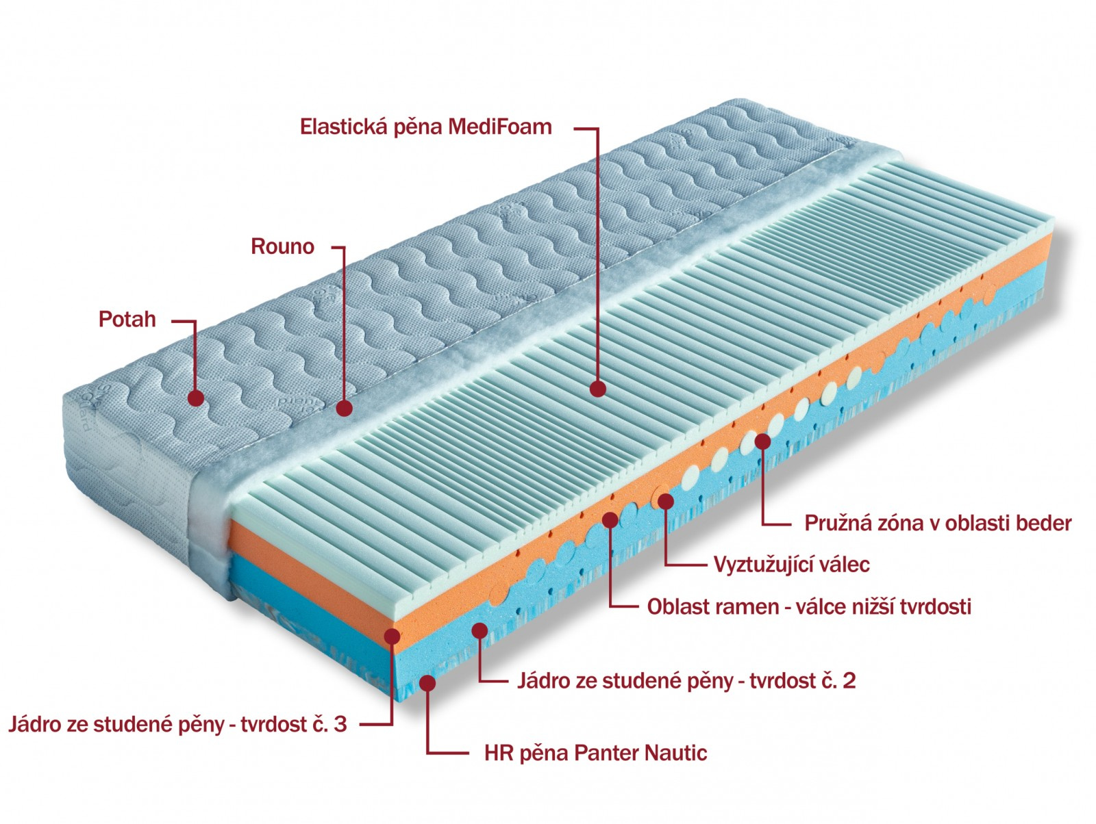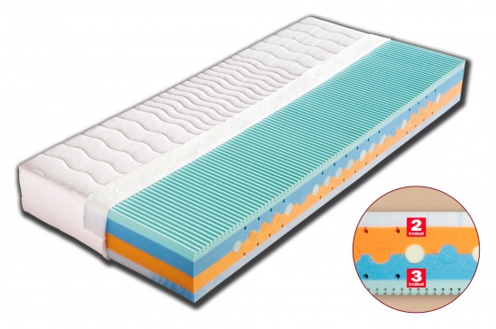 Kvalitní oboustranná matrace tvořena perforovaným jádrem ze studené pěny dvou tvrdostí s vloženými válci ze studených pěn různých tuhostí.Nosné vrstvy tvoří speciálně profilovaná masážní vrstva s panáčky,která zabezpečuje dokonalé prokrvení pokožkya uvolňuje svaly v průběhu spánku.Druhou nosnou vrstvu tvoří extrémně prodyšná HR studená pěna se změkčujícím efektem a příjemně hladkým,nebeským povrchem. Matraci je vhodné položit na pevný nebo polohovací lamelový rošt. Matrace lze vybrat v potahu SILVERGUARD,MEDICOTT,LYOCELL - antibakteriální potah nebo LEVANDULE - s relaxačními účinky. V objednávce prosím uveďte Vámi vybraný potah. Výška matrace včetně potahu 22 cm. Matrace do hmotnosti 120 kg. K této matraci nabízíme jako dárek zdarma 1x polštář Lukáš.