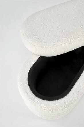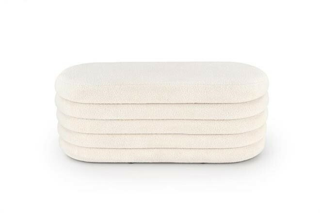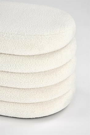 Taburet je potažený příjemnou buklé tkaninou v krémové barvě, která připomíná ovčí srst. Poradí si s až 100 kg. Zboží dodáváme v demontu.