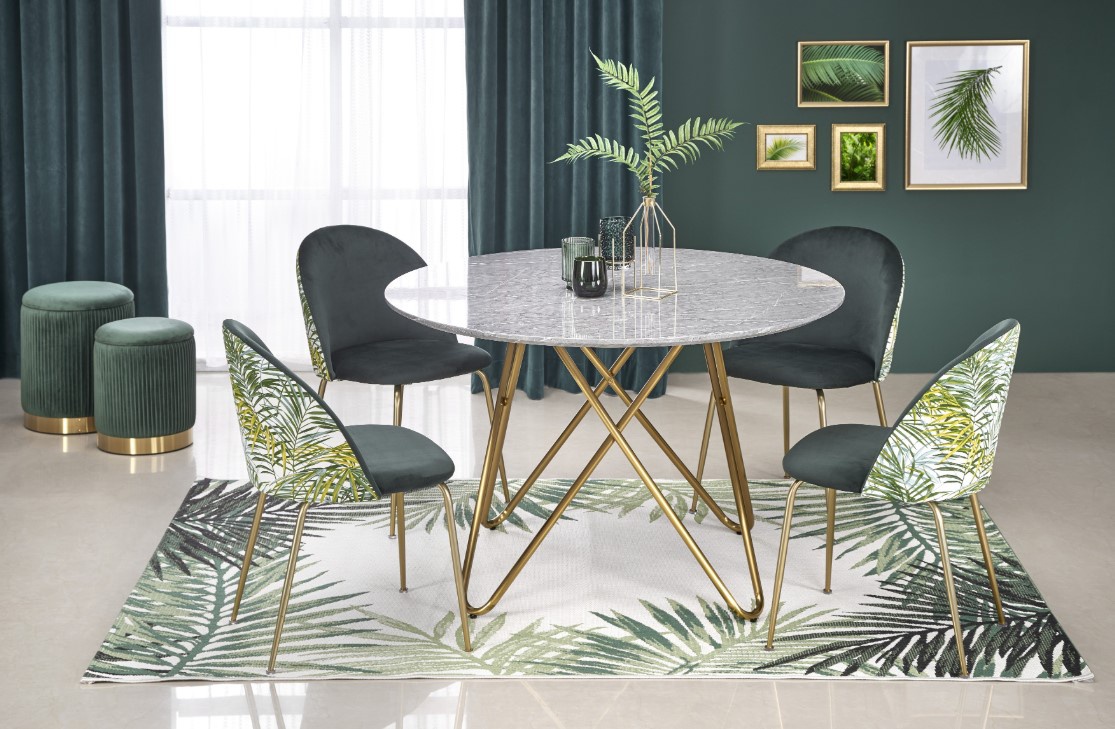 Krásný stůl je vyroben z dýhované MDF v barvě šedý mramor s nohami z chromované oceli v barvě zlaté. Židle nejsou součástí stolu. Zboží je dodáváno v demontu.
