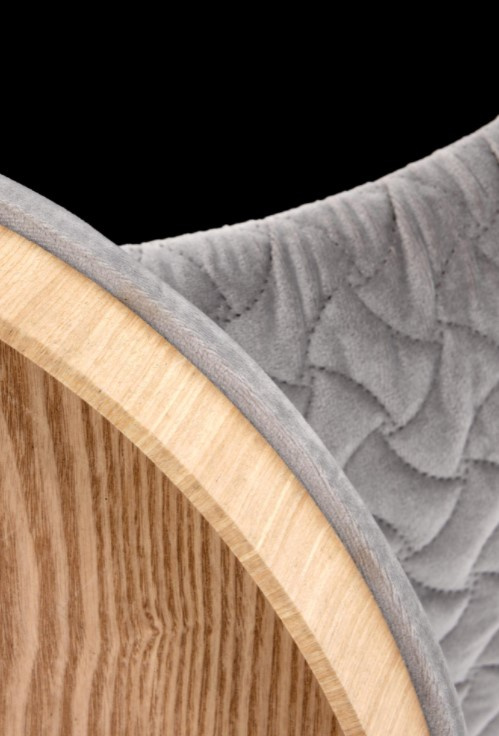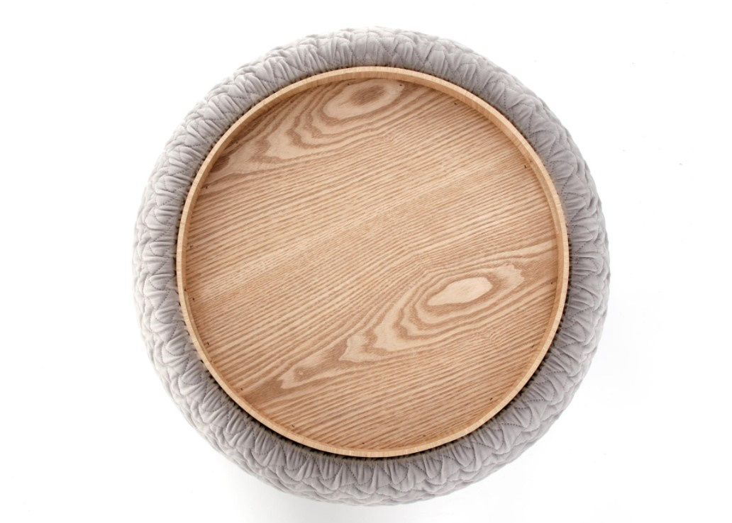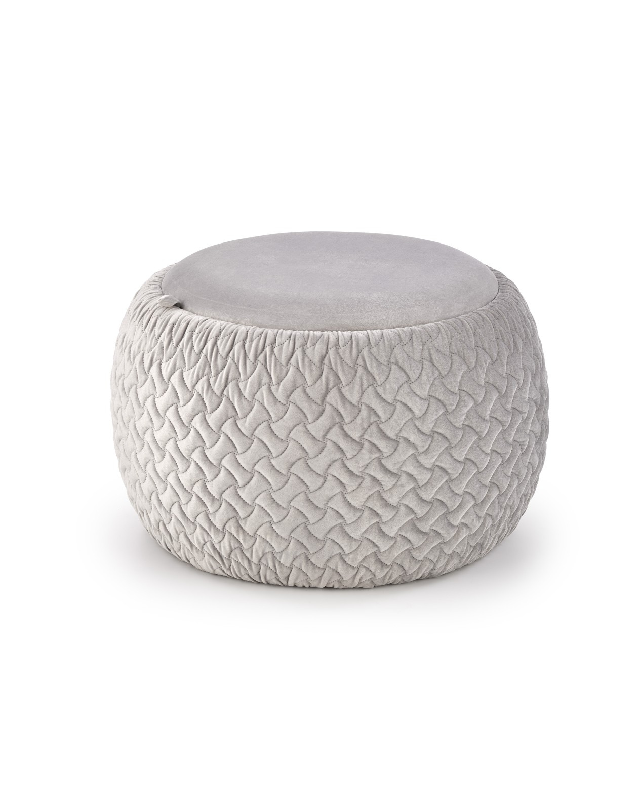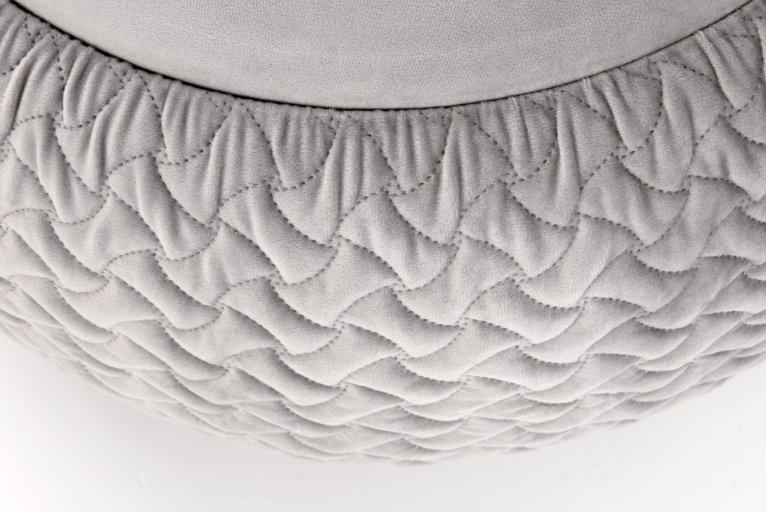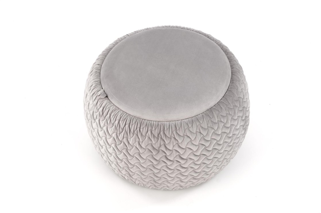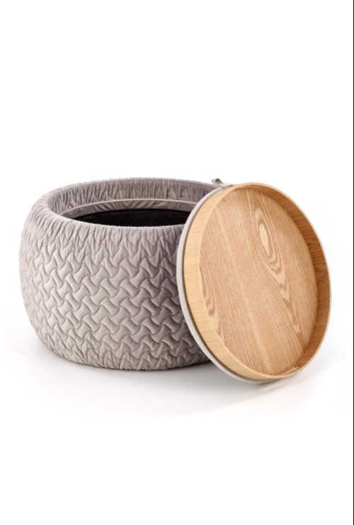 Válcový taburet očalouněný světle šedou látkou. Taburet má úložný prostor, víko je z dýhované MDF. Je ozdoben stylovým prošíváním.