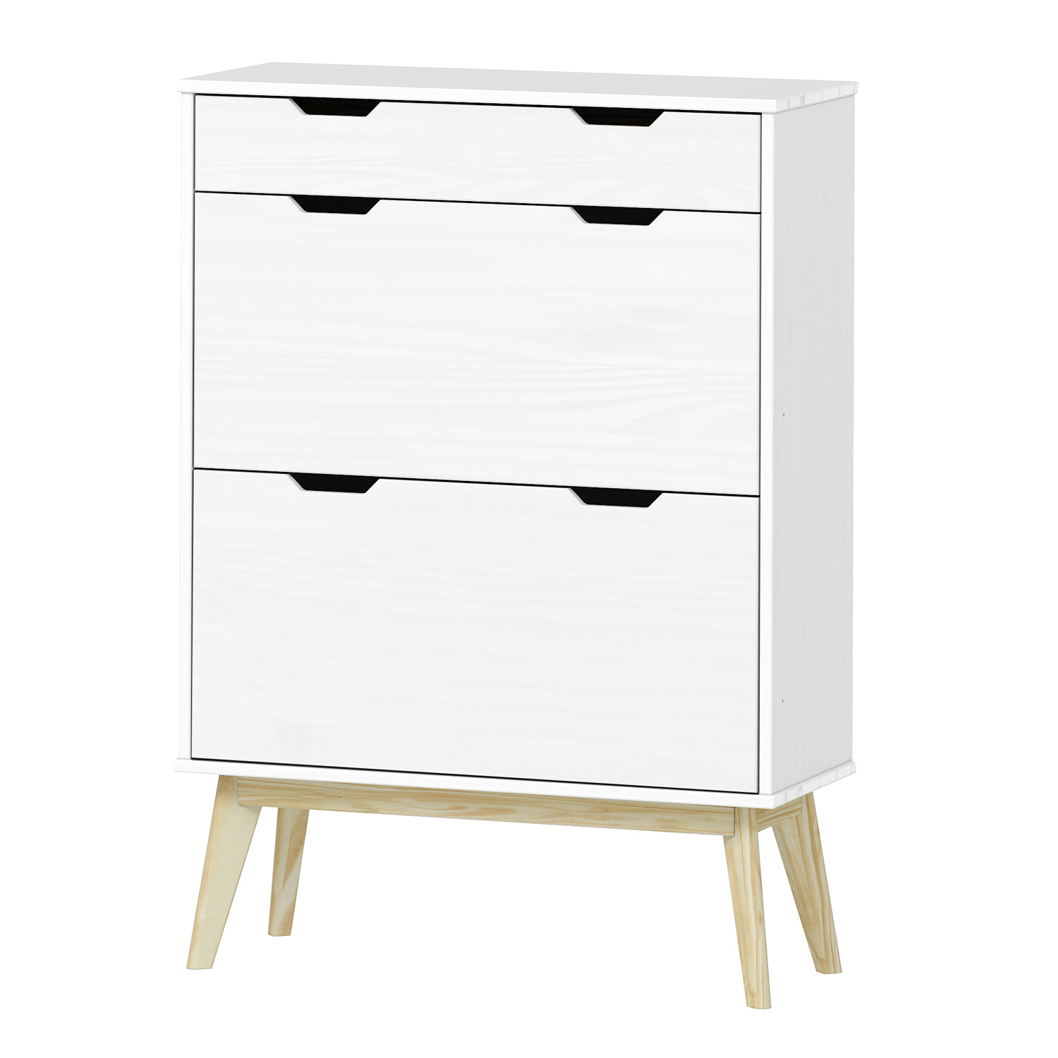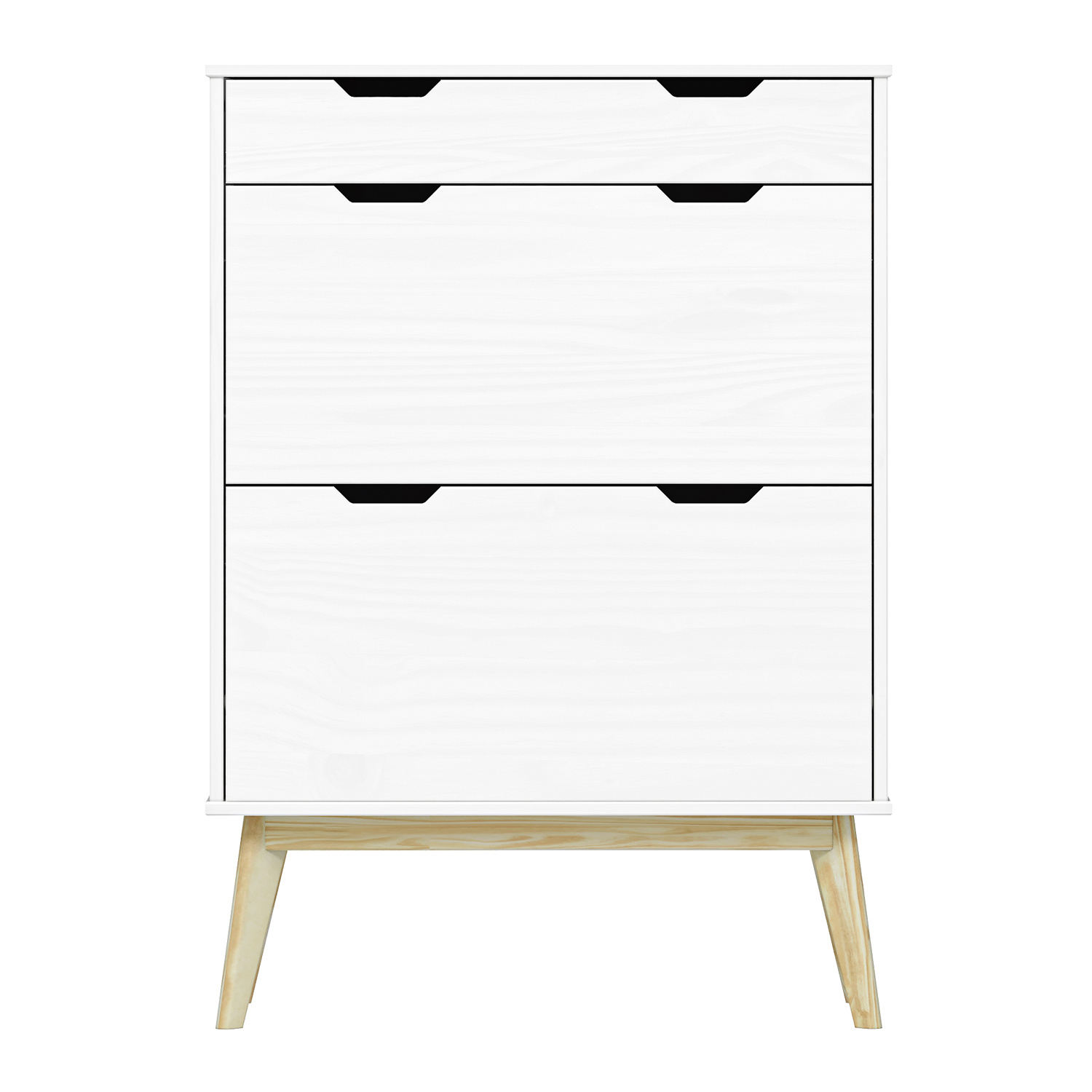 materiál masiv borovice, barevné provedení bílý lak 1 zásuvka s kovovými pojezdy, 2 dvouřadé výklopy