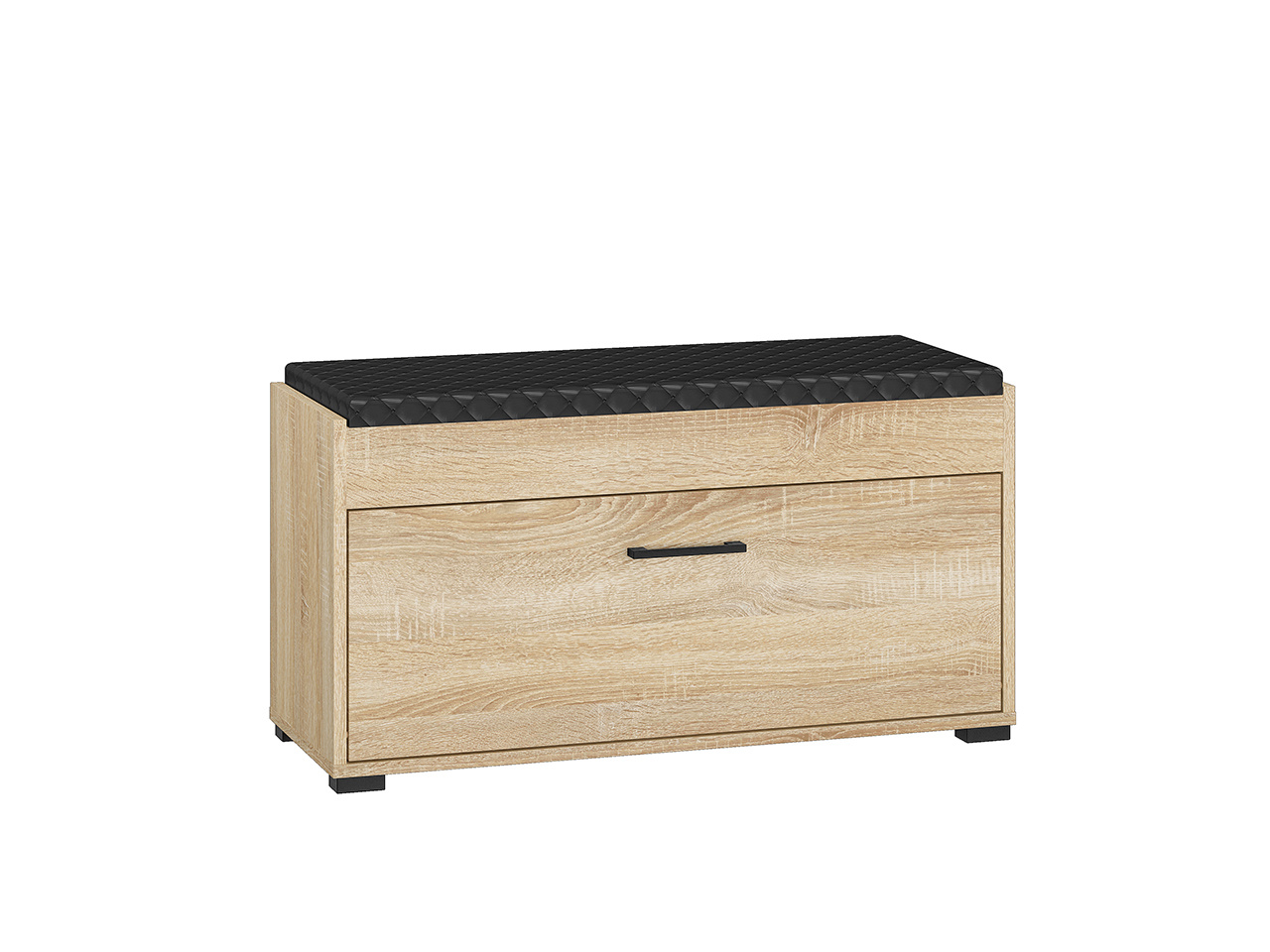 Botník s výklopnými dvířky je vyroben z kvalitního lamina o tl.16 mm v dezénu sonoma světlá. Sedací část botníku je doplněna o pohodlné polstrované sezení v barvě černá. Tento botník je doplněn o černé nožičky a úchytku. Zboží je dodáváno v demontu.