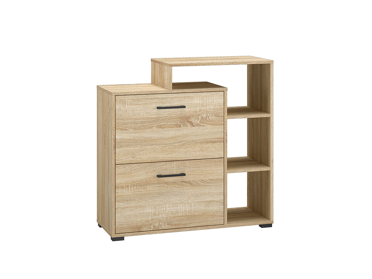Botník s výklopnými dvířky je vyroben z kvalitního lamina o tl.16 mm v dezénu sonoma světlá. Tento botník je doplněn o černé nožičky a úchytku. Zboží je dodáváno v demontu.