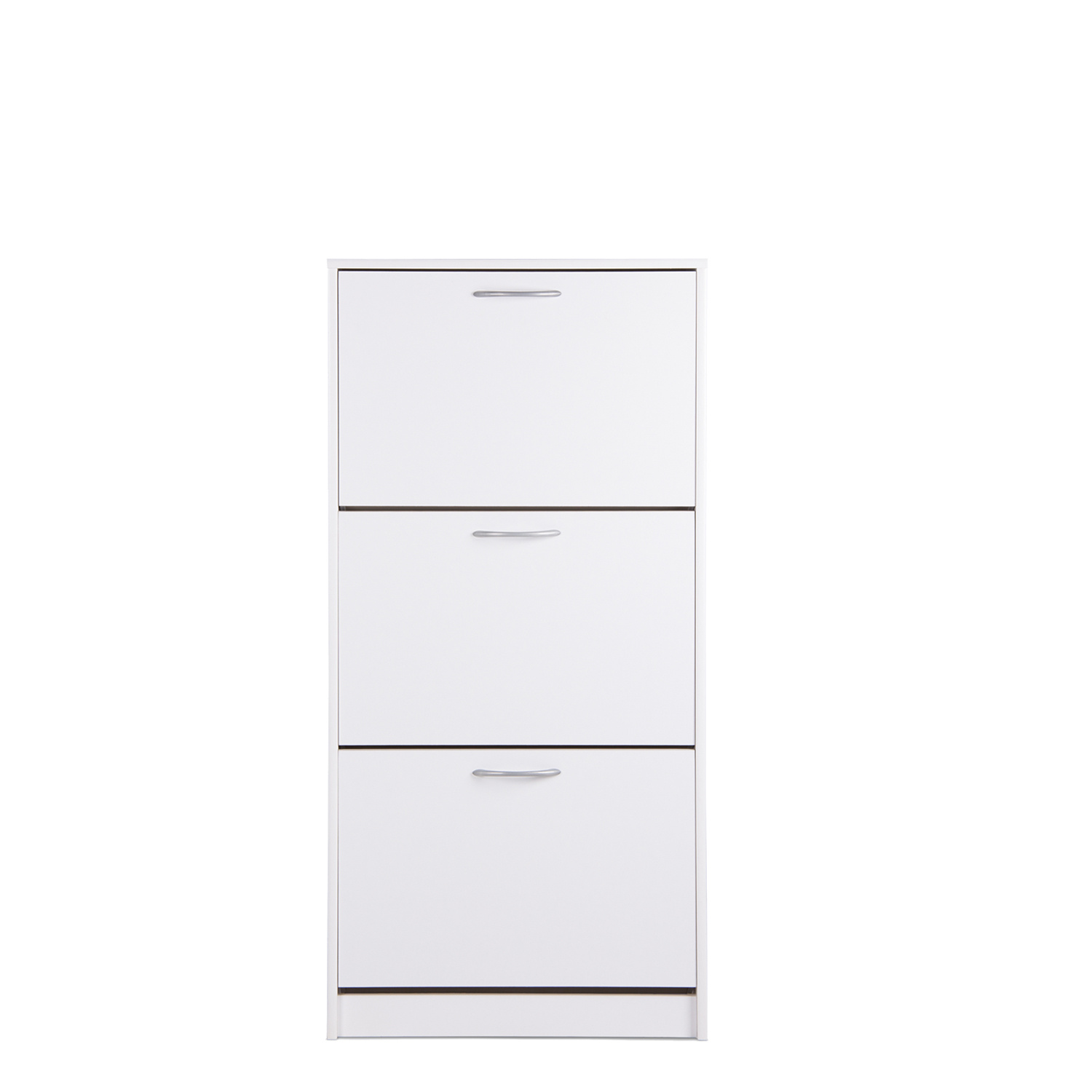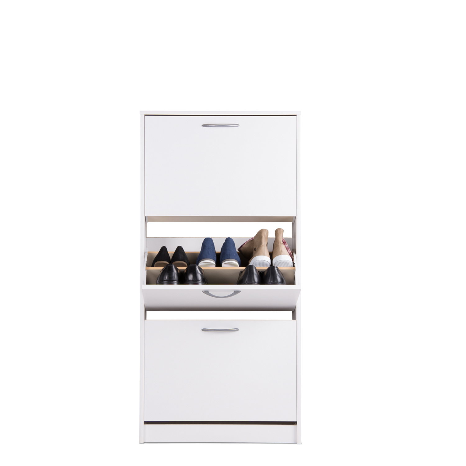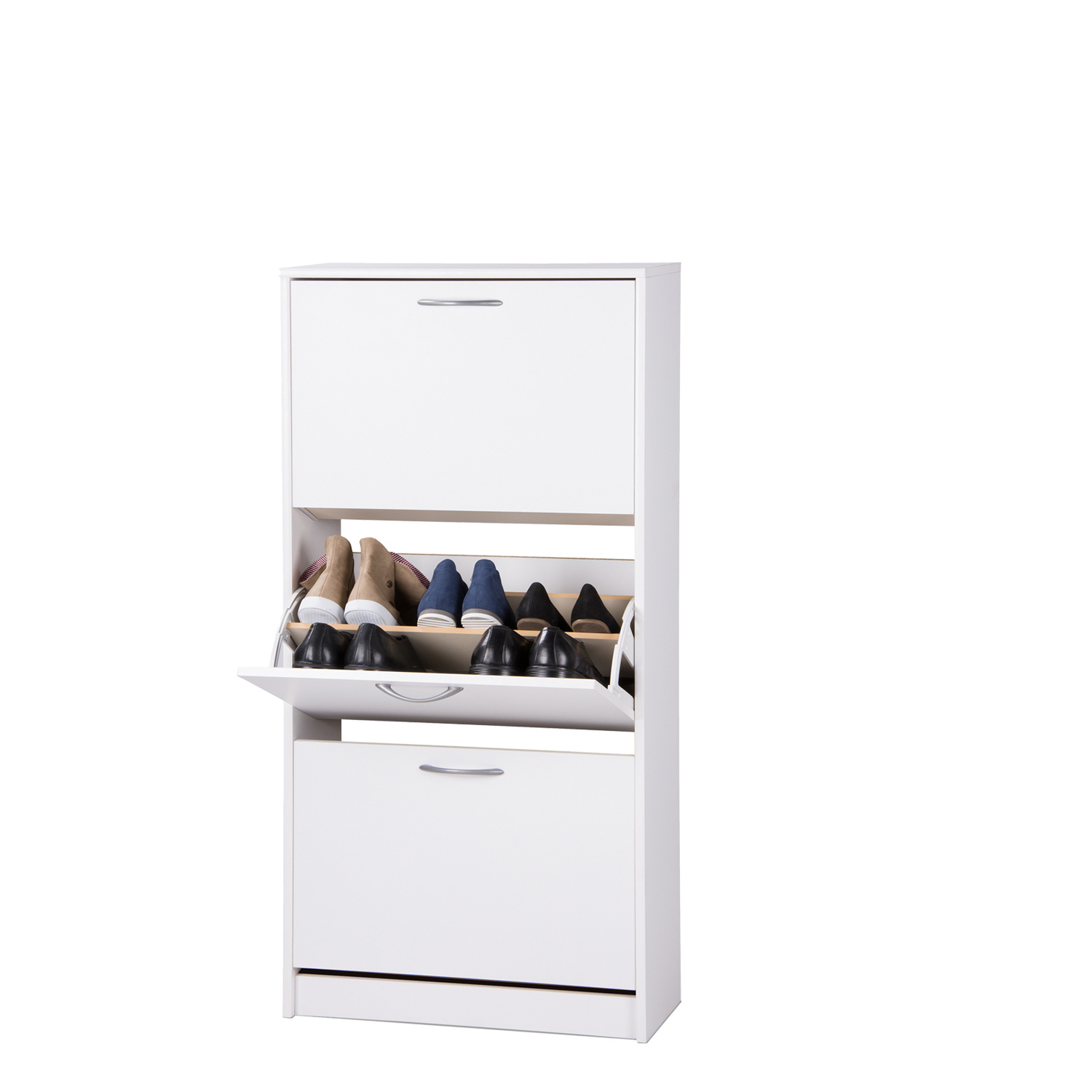 Výklopný botník je vyroben z laminované dřevotřísky v bílé barvě. Tři dvouřadé výklopné zásuvky nabízí prostor na 18 párů bot. Botník nemá zadní stěnu. Zadní část je opatřena výztuhami.Tento dřevěný botník je díky univerzálnímu designu vhodný k použití do předsíní, hal nebo garáží k ukládání obuvi. Zboží dodáváme v demontu.