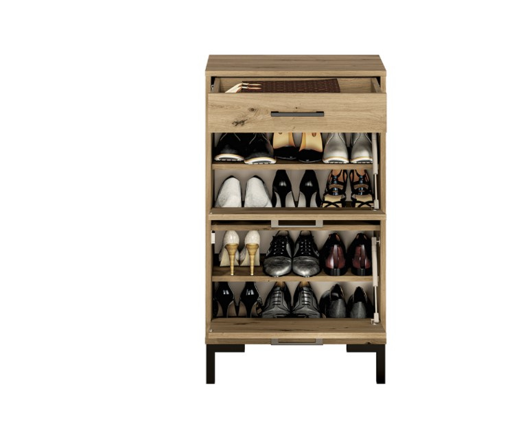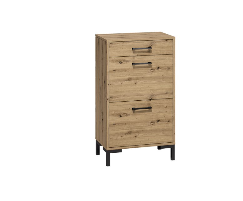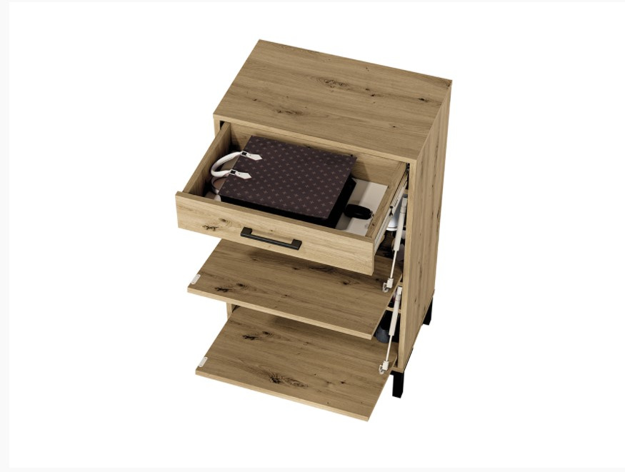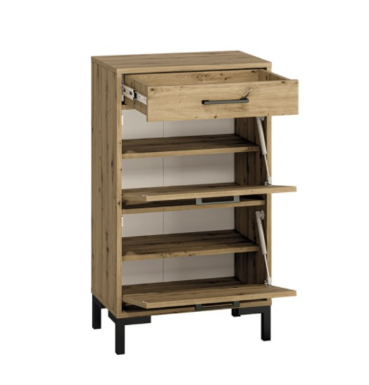 NEVIO je moderní a elegantní kolekce nábytku do předsíně. Kombinace výrazného dekoru dub artisan s černými úchytkami a nohami je dokonalým řešením pro moderní interiér. Díky rozmanitosti systému můžete snadno vybavit malou předsíň i velkou halu. Botník má jeden šuplík a dva výklopné boxy na obuv. Zboží je dodáváno v demontu.