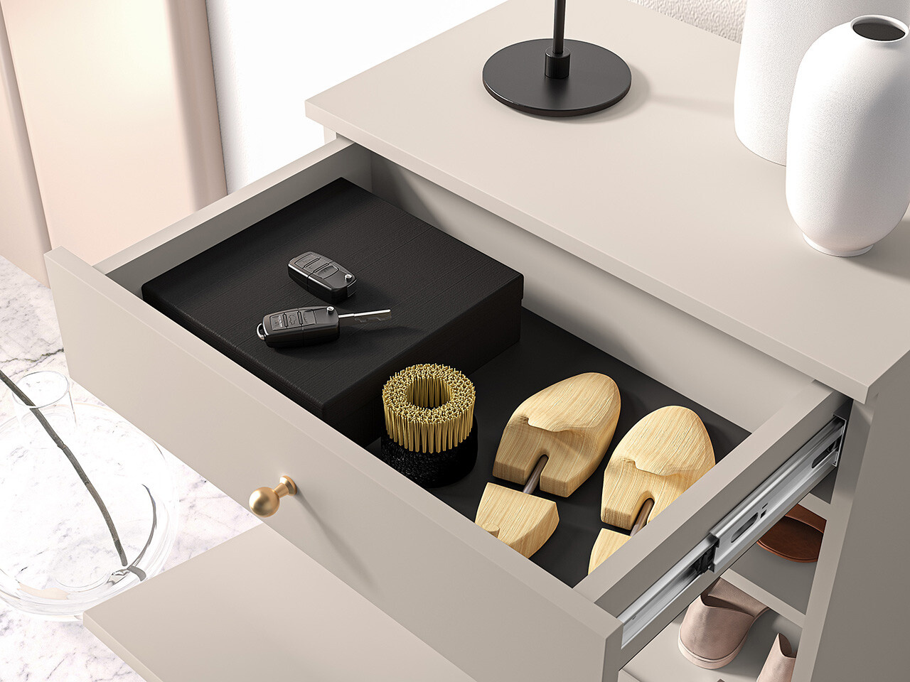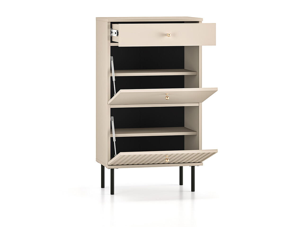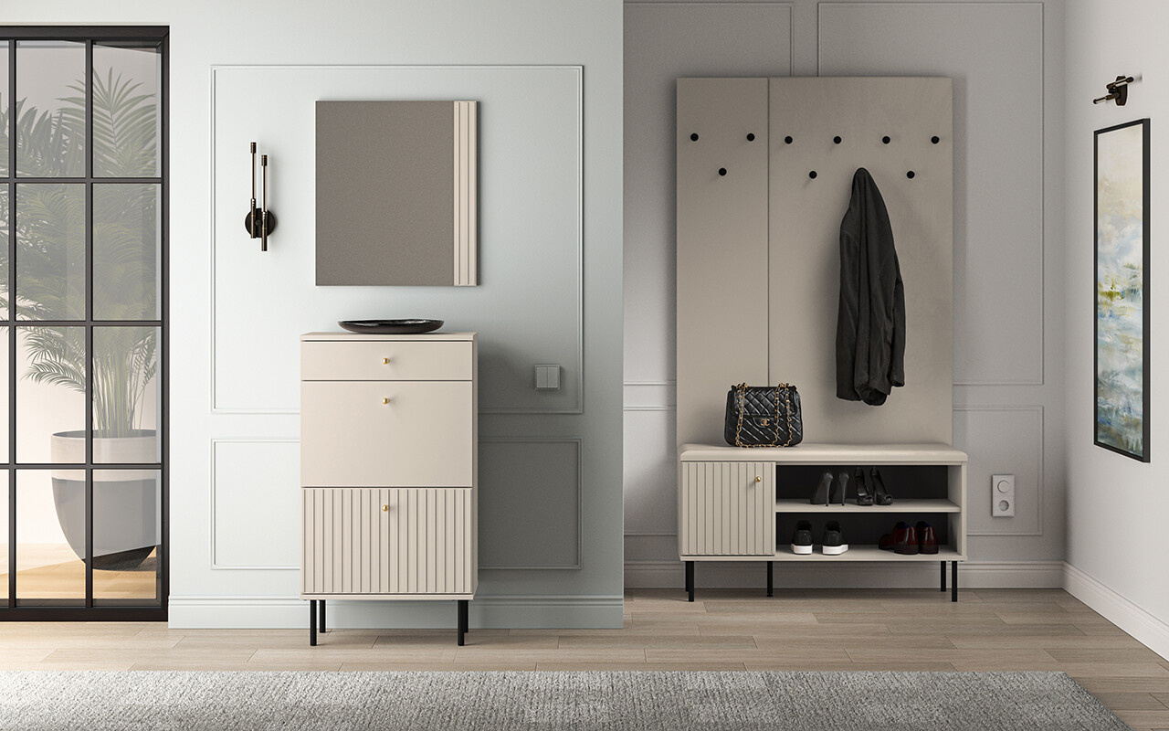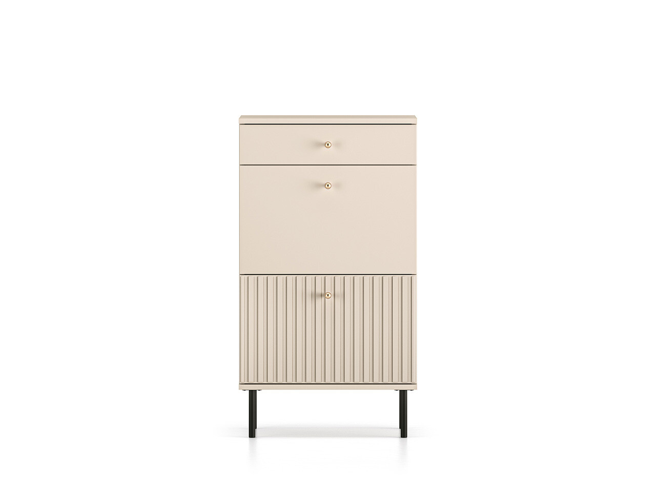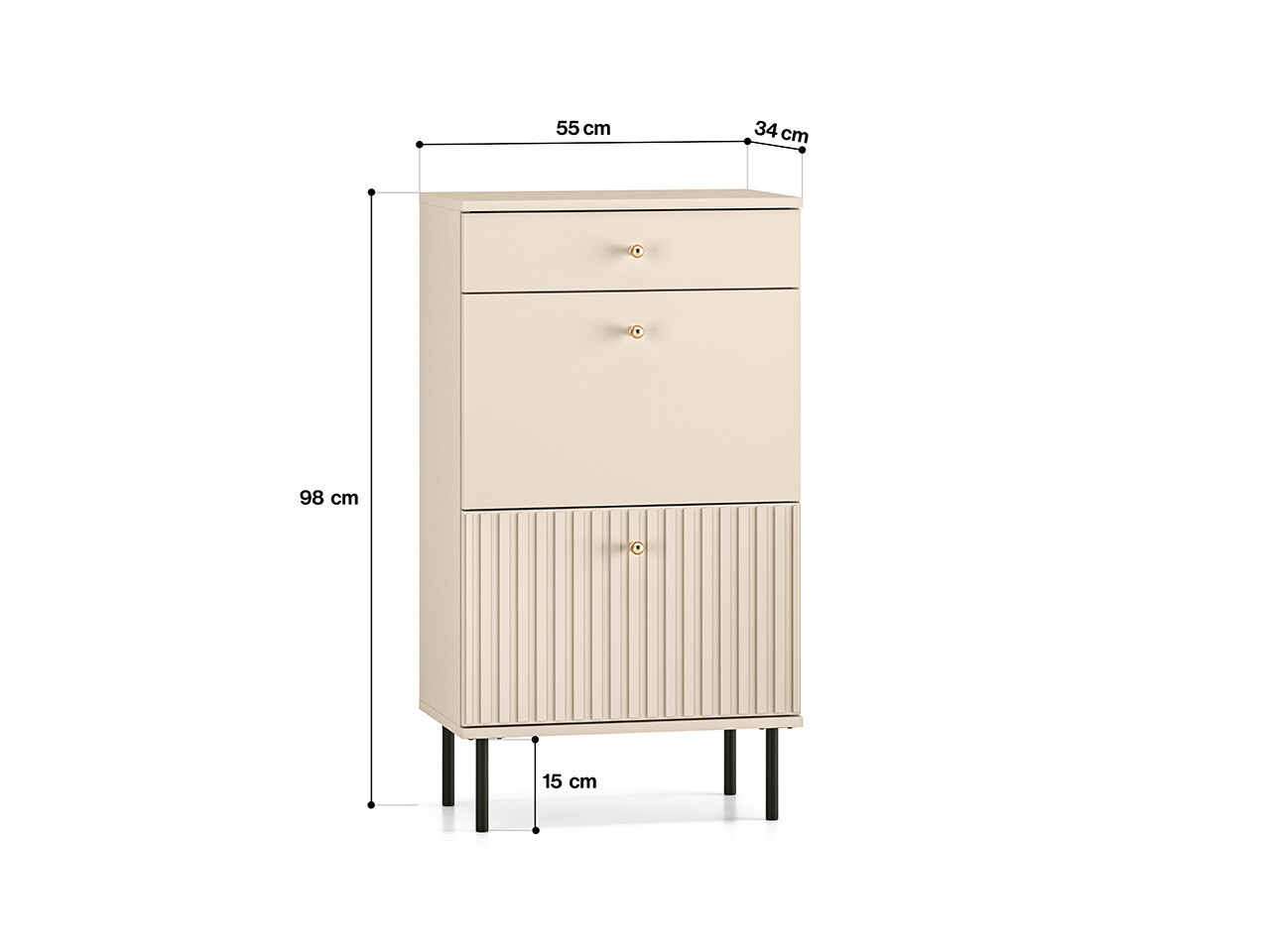 Botník SOPHIE je vyrobena z vysoce kvalitní laminované dřevotřískové desky s ABS hranou v kašmírové barvě. Vyznačuje se stylovými černými kovovými nohami a drážkovanými předními čílky se zlatými úchytkami. Kuličkové vodítka a panty s tichým zavíráním zajišťují komfort používání. Zboží dodáváme v demontu.