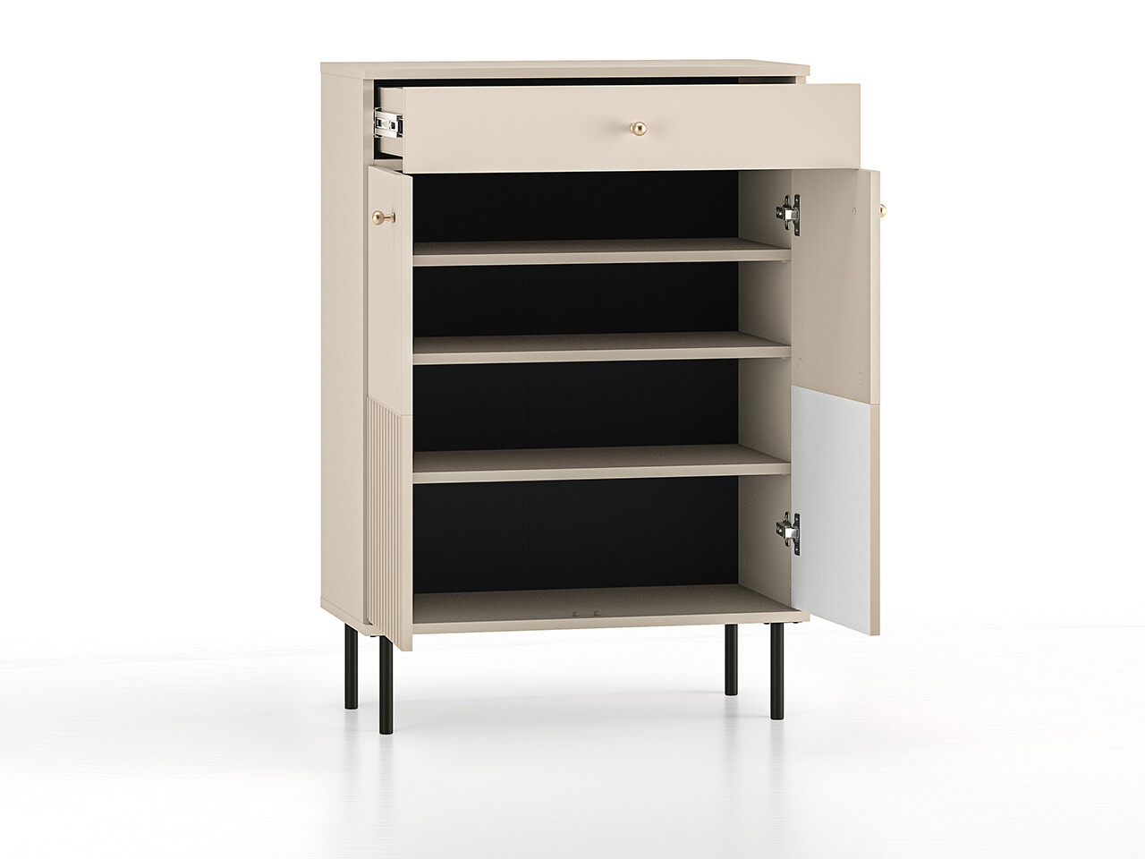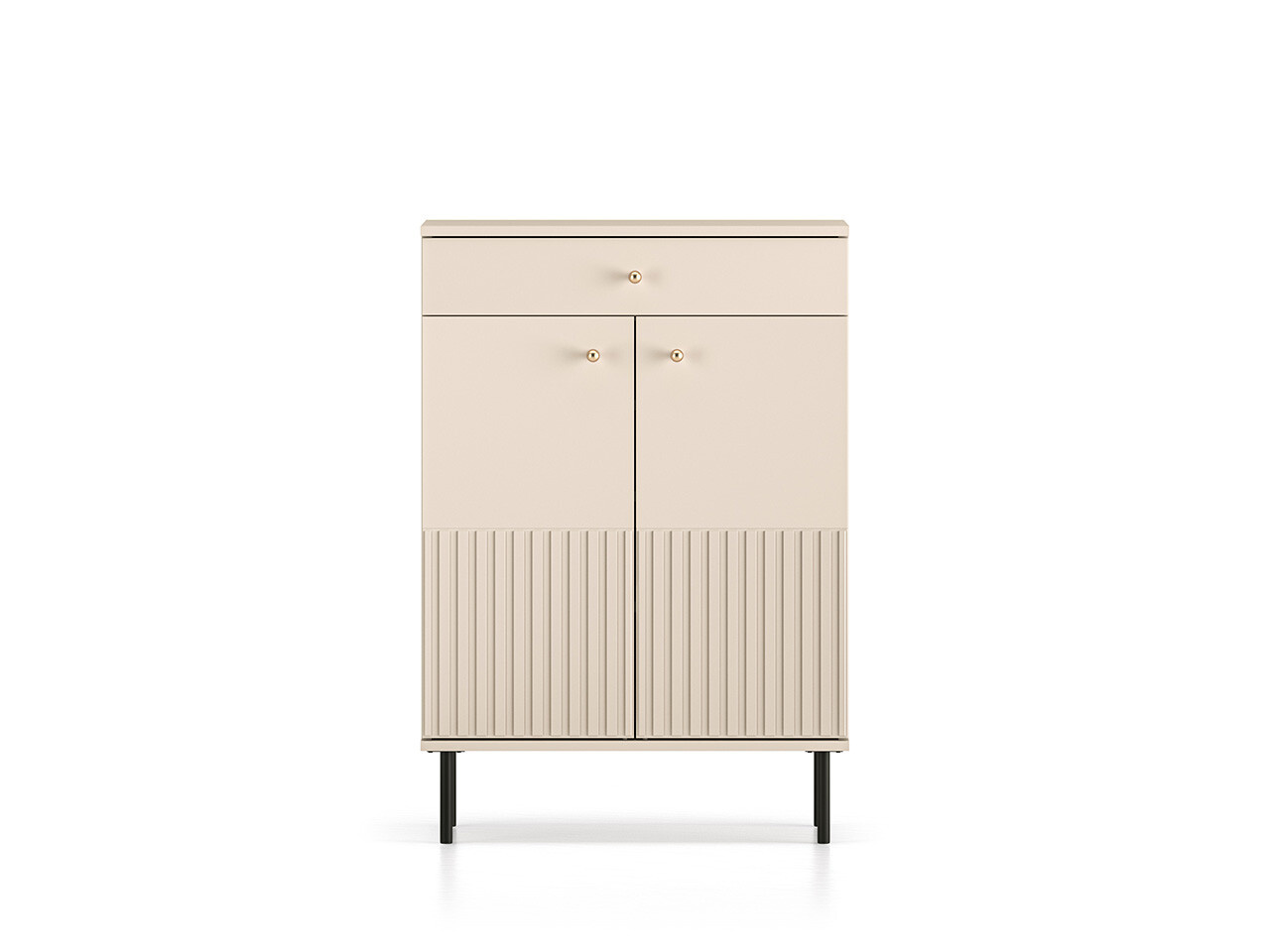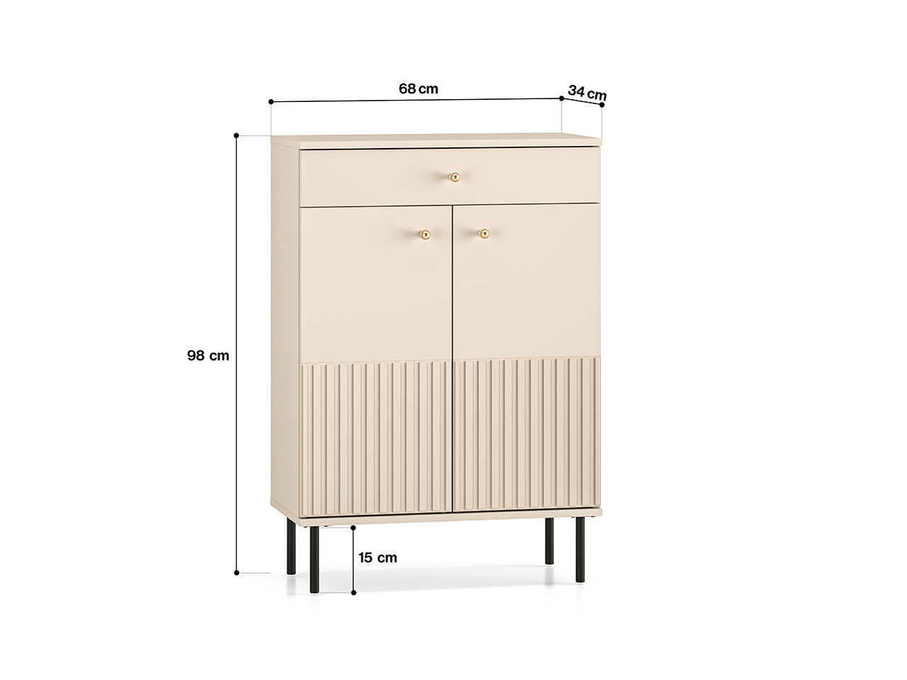 Botník SOPHIE je vyrobena z vysoce kvalitní laminované dřevotřískové desky s ABS hranou v kašmírové barvě. Vyznačuje se stylovými černými kovovými nohami a drážkovanými předními čílky se zlatými úchytkami. Kuličkové vodítka a panty s tichým zavíráním zajišťují komfort používání. Zboží dodáváme v demontu.