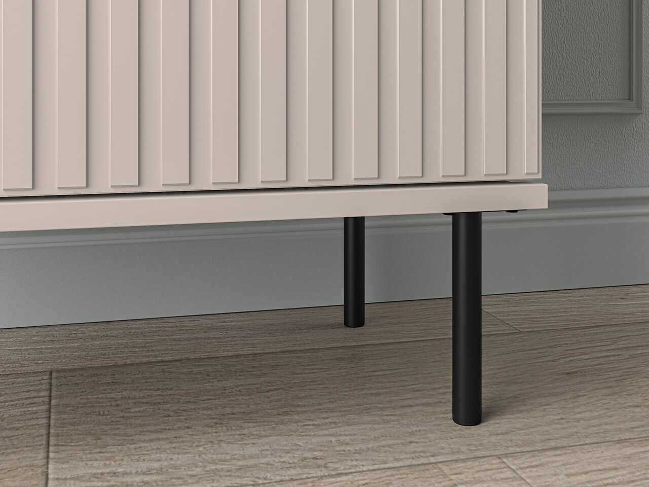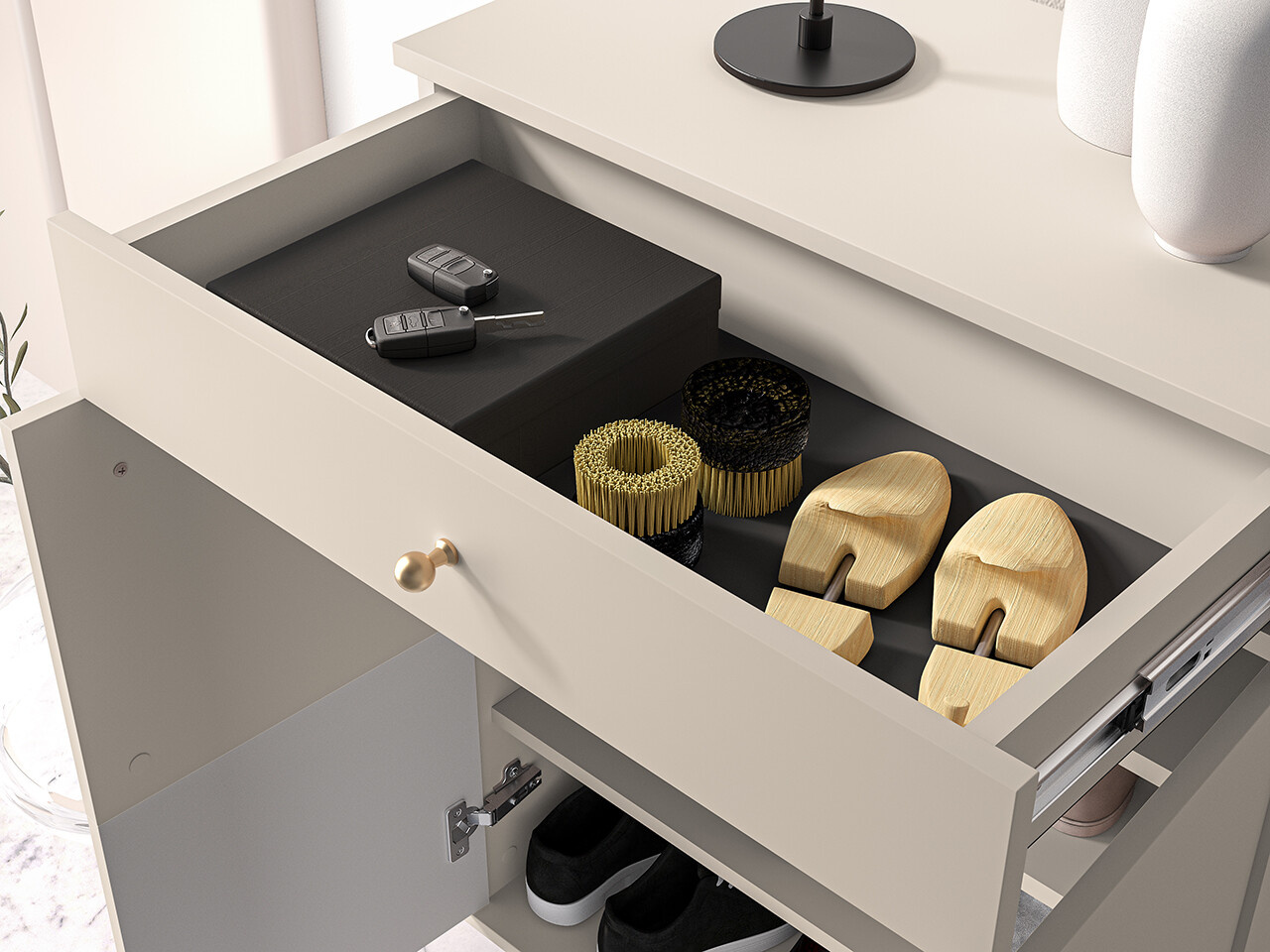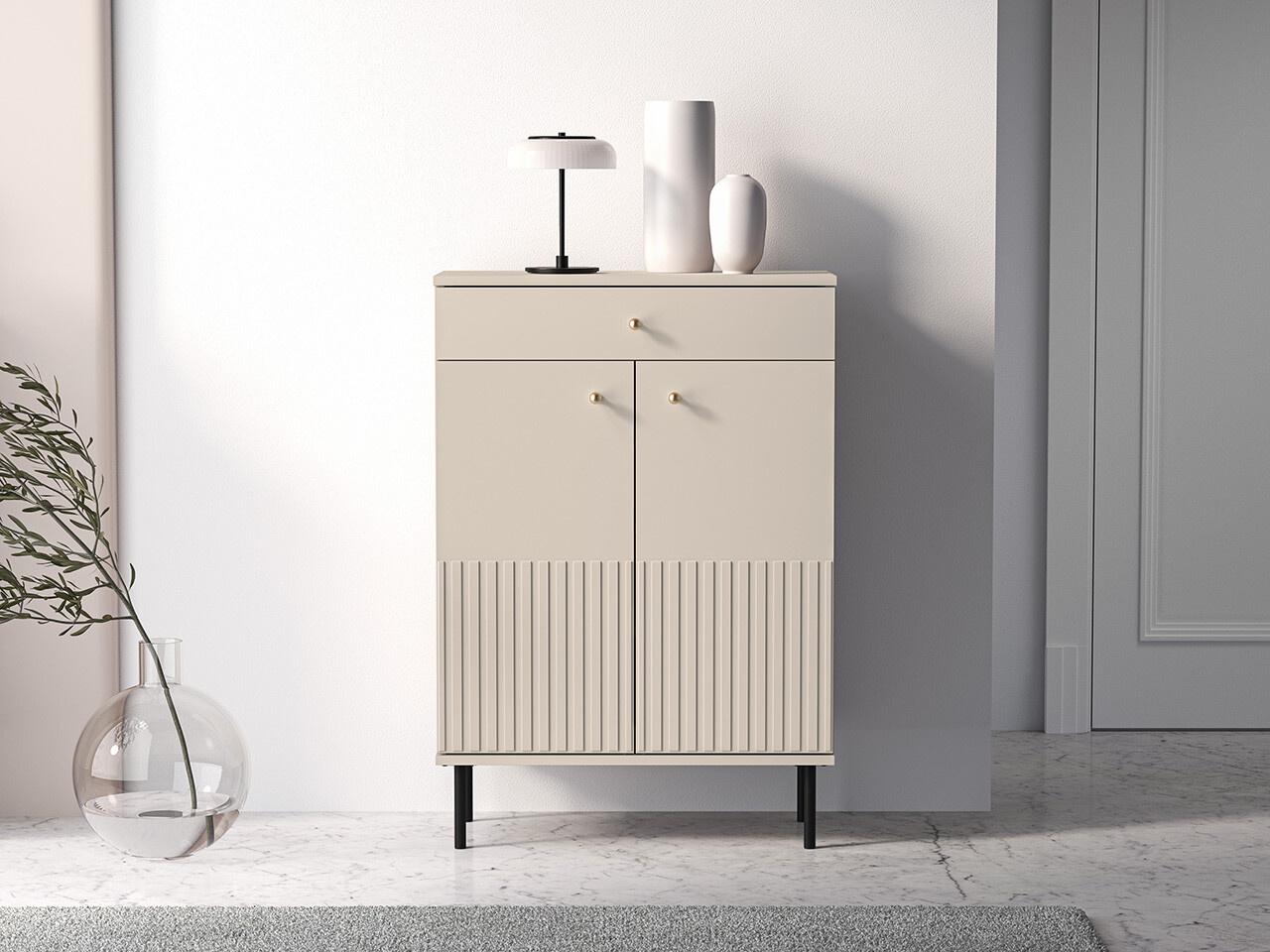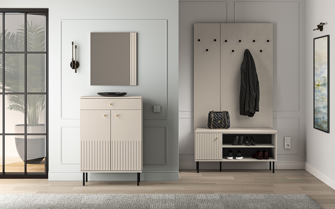 Botník SOPHIE je vyrobena z vysoce kvalitní laminované dřevotřískové desky s ABS hranou v kašmírové barvě. Vyznačuje se stylovými černými kovovými nohami a drážkovanými předními čílky se zlatými úchytkami. Kuličkové vodítka a panty s tichým zavíráním zajišťují komfort používání. Zboží dodáváme v demontu.