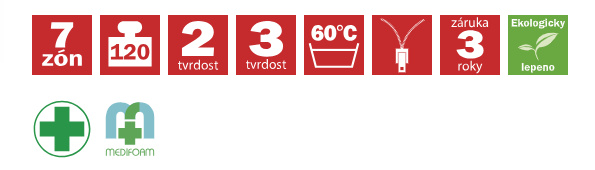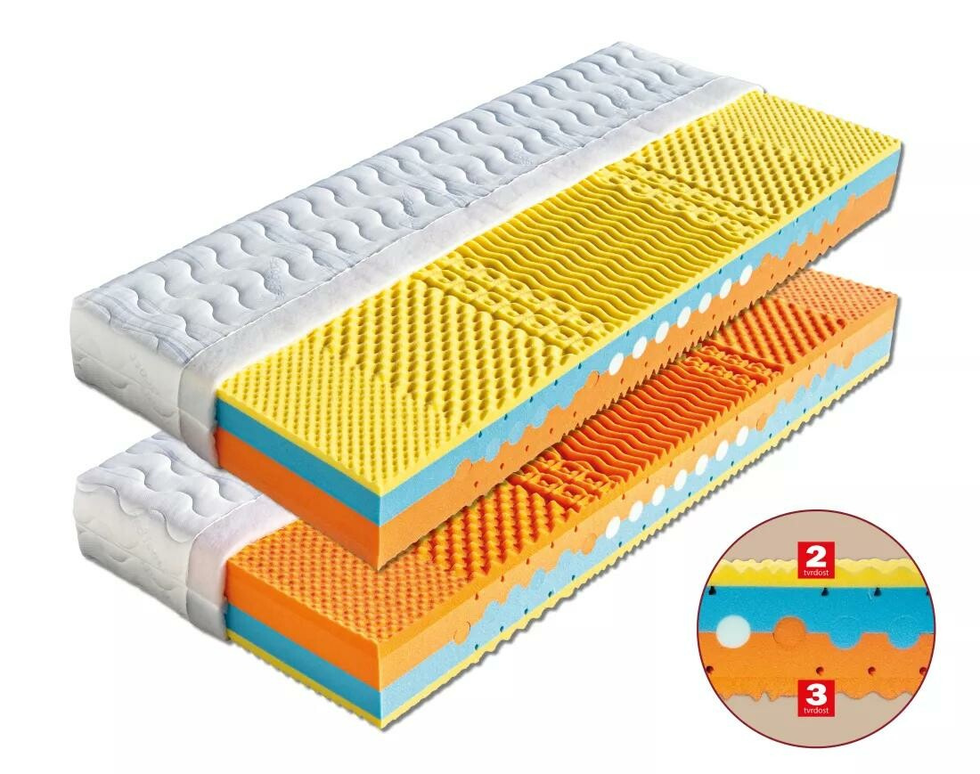 Luxusní matrace tvořena perforovaným jádrem ze studené pěny dvou tuhostí s vloženými válci ze studených pěn různých tuhostí. Oboustranná matrace, kde nosné vrstvy tvoří viscoelastická pěna tvarovaná do masážních nopků, které zabezpečují dokonalé prokrvení pokožky a uvolňují svaly v průběhu spánku. Sedmizónové rozdělení nopů je důležité i ze zdravotního hlediska. Z každé strany matrace je použita viscoelastická pěna s různou tuhostí a proto je matrace vhodná pro široké spektrum uživatelů. Matraci je vhodné položit na pevný nebo polohovací lamelový rošt. Matrace lze vybrat v potahu SILVERGUARD,MEDICOTT,LYOCELL - antibakteriální potah nebo LEVANDULE - s relaxačními účinky. V objednávce prosím uveďte Vámi vybraný potah. Výška matrace včetně potahu 23 cm. Matrace do hmotnosti 120 kg.