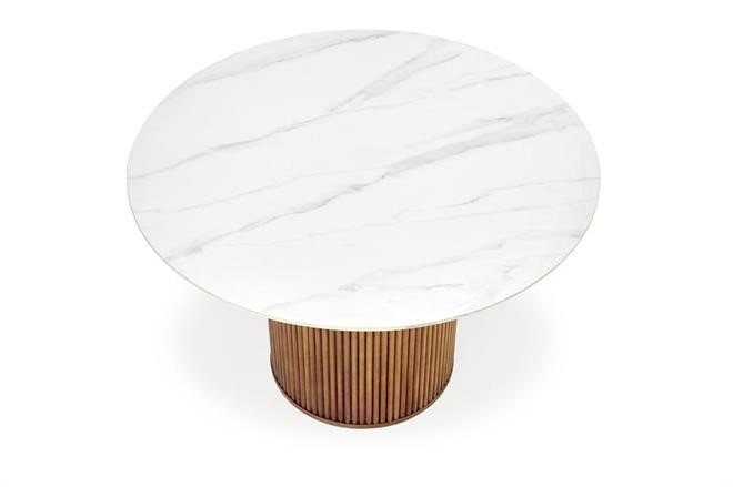 Moderní jídelní stůl má desku vyrobenou ze skla v provedení bílá mramor a noho ze dřeva v barevném provedení ořech. Židle nejsou součástí produktu. Zboží dodáváme v demontu.