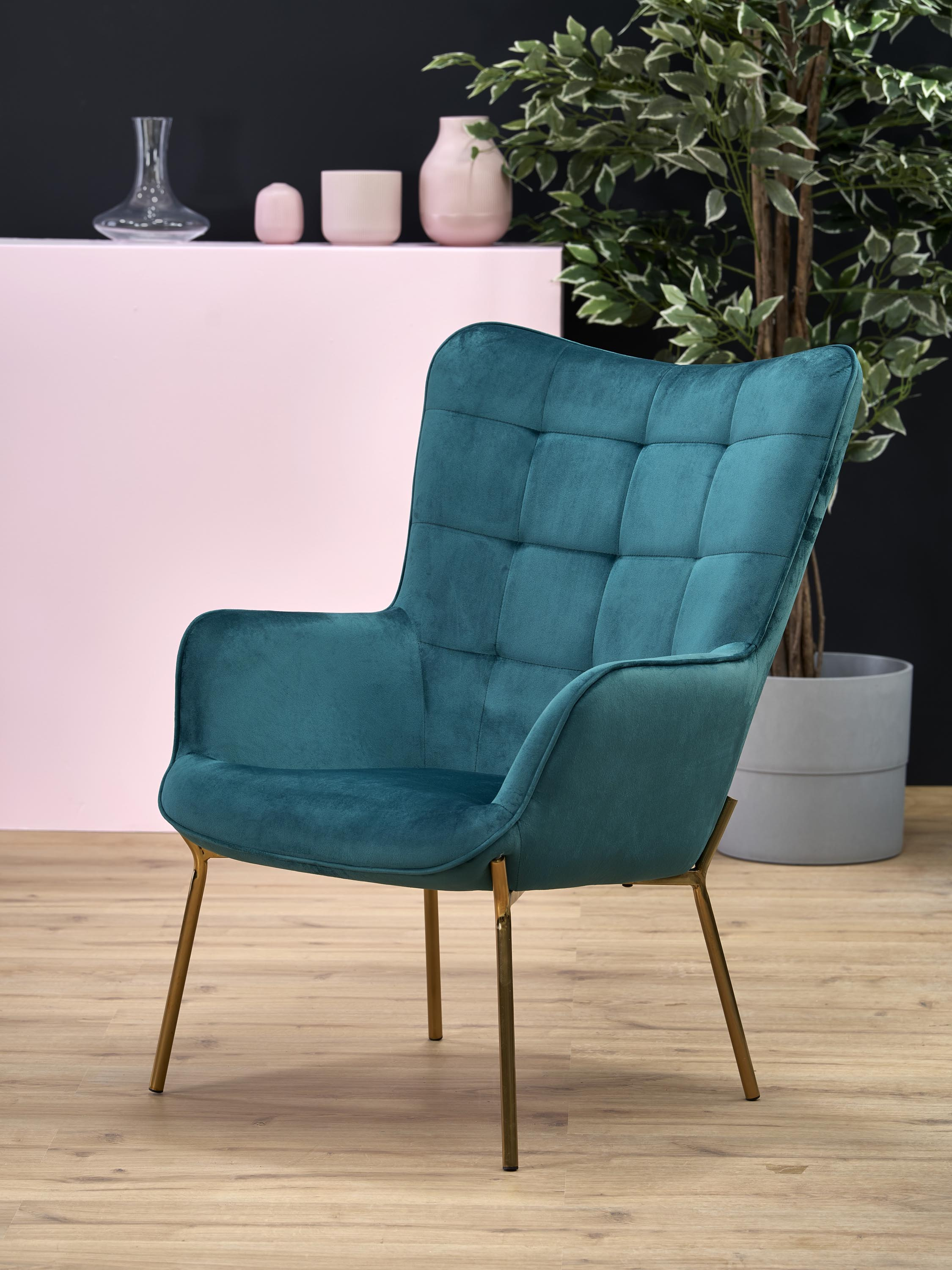 Moderní čalouněné křeslo v tmavě zelené barvě s chromovanými nožkami v barvě zlatá. Max. nosnost 120kg.