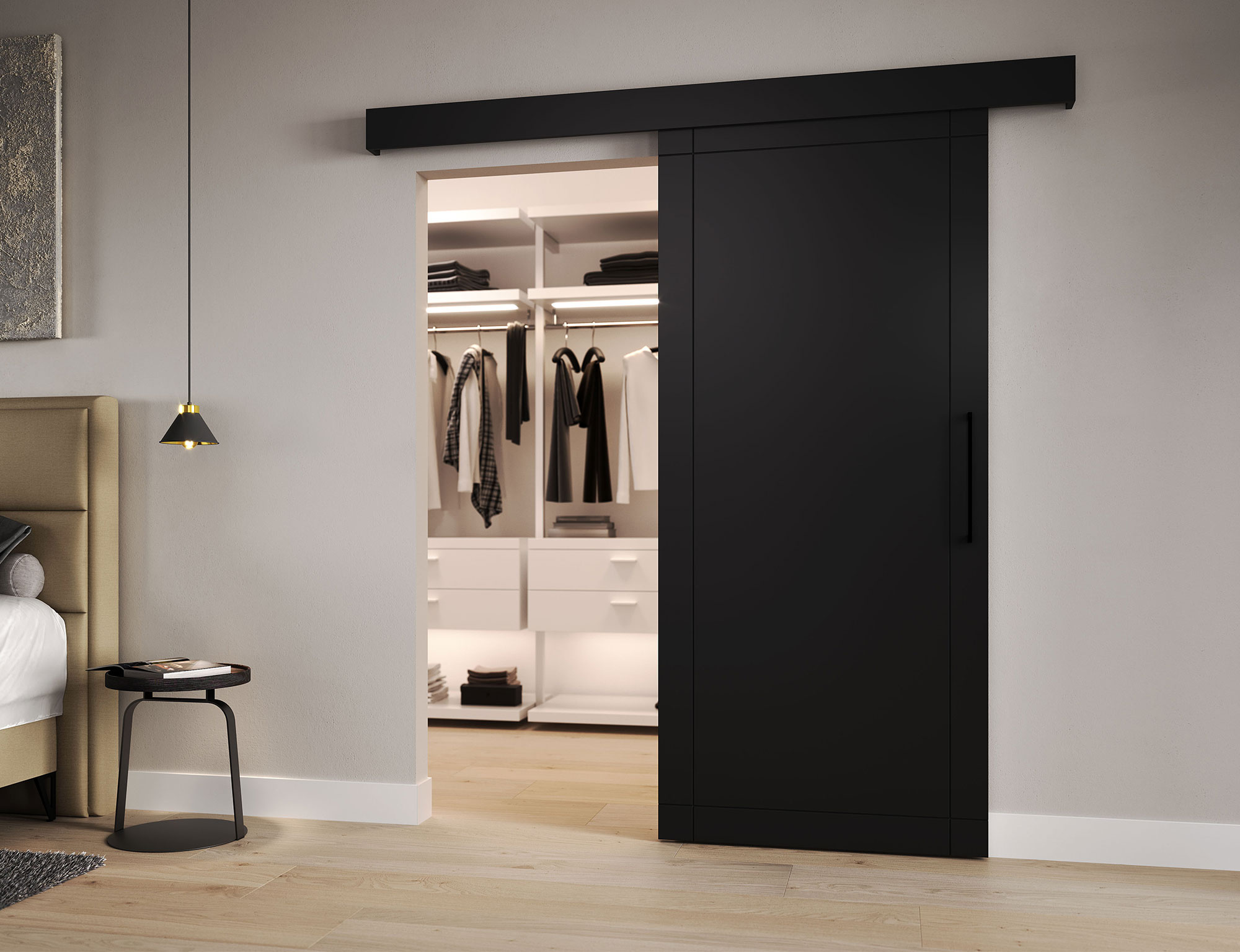 The minimalist design and high-quality materials make Charlise doors ideal for the living room, kitchen, or bedroom. They measure 90 cm in width and 204 cm in height, fitting standard door openings. Made of laminated furniture board, they are available in semi-matte black (Black 190PE).Equipped with the Laguna STANDARD 1990 mechanism with a 195 cm guide rail, Charlise doors slide smoothly and quietly. The set includes a cover made of laminated furniture board and a black plastic handle. The doors are available with or without a soft-close mechanism and have a stopper, a trolley, and a bottom guide, ensuring safety and convenience.Installation is simple, done by mounting to the wall. Charlise sliding doors are the perfect solution for those who value functionality, aesthetics, and modern design.