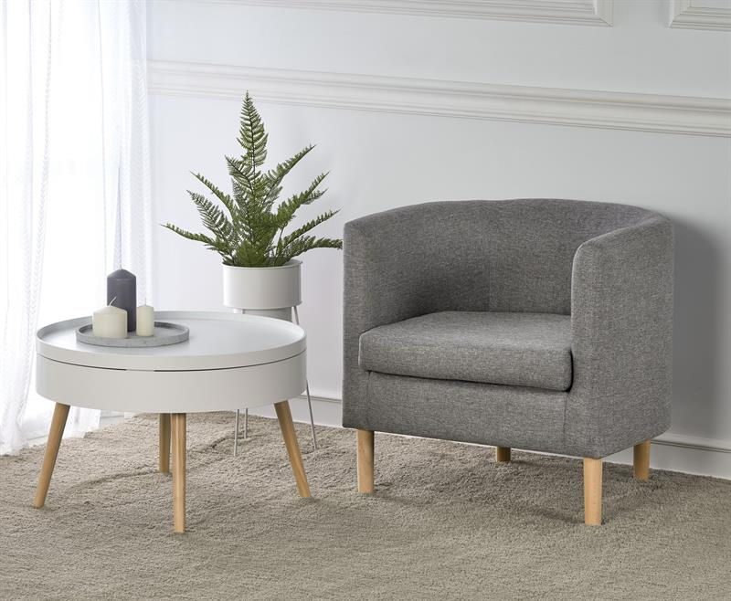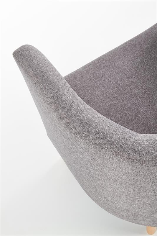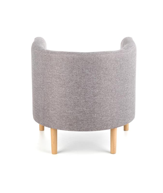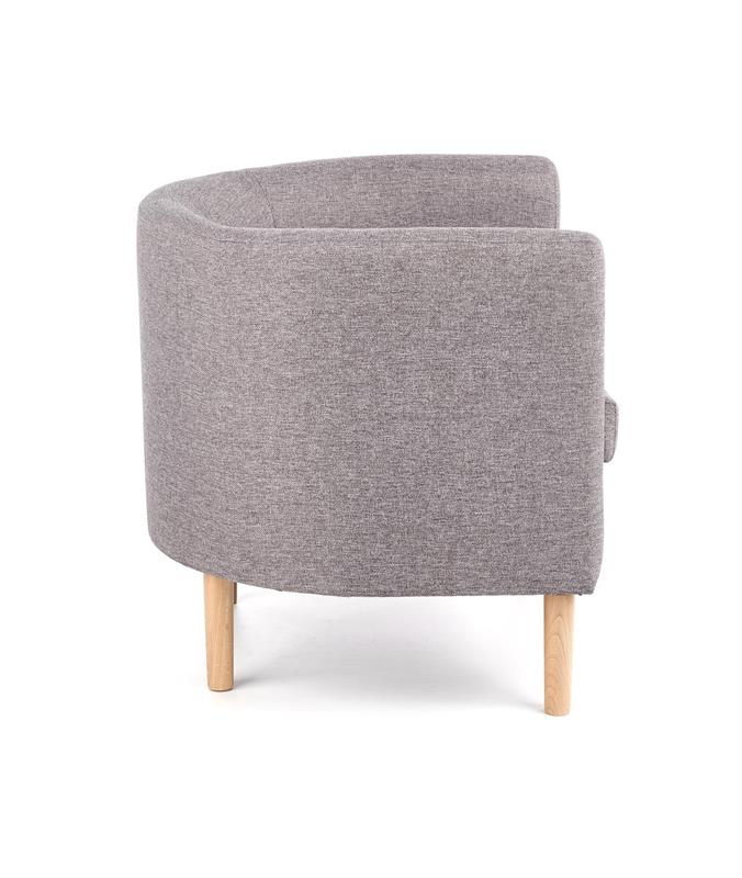 Křeslo CLUBBY je očalouněno šedou tkaninou, nožky jsou z masivu v přírodní barvě. Hodí se do interiéru zařízeném v retro nebo skandinávském stylu.