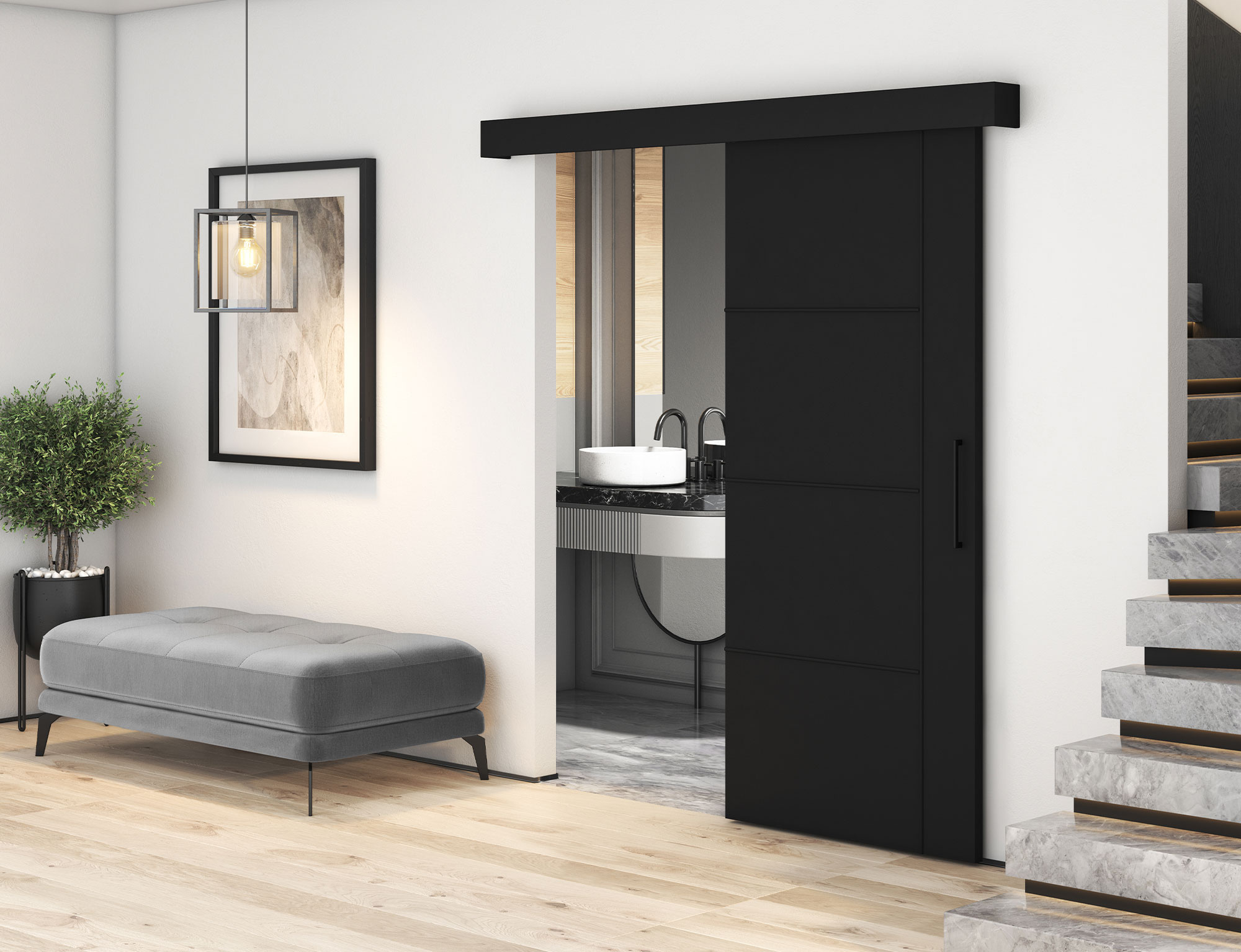 Crestina sliding doors are a modern and elegant solution, perfectly fitting into any interior and adding a unique character to it. They measure 96.5 cm x 205 cm and are made of laminated furniture board and plastic. Their black semi-matte finish gives them a stylish look.The Laguna S100 mechanism ensures smooth and quiet door sliding, and the set includes a cover and a black handle adding modernity. Equipped with a stopper, a trolley, and a bottom guide, they ensure safety and convenience.Door installation is simple and done by mounting to the wall. Crestina is an excellent choice for those looking for a stylish and functional addition to their interior, providing maximum space utilization.