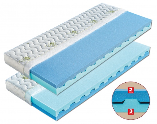 Tato matrace je ideální pro děti a mládež. Je složená ze dvou elastických pěn odlišných objemových hmotností a nabízí volbu dvojí tvrdosti. Měkčí stranu tvoří studená HR pěna, která je poddajná a velmi elastická. Naproti tomu světle modrá polyuretanová pěna je pevnější, s tvrdostí č. 3. Střed jádra matrace je provzdušněn příčnými průduchy, které zaručují změkčení matrace v exponovaných místech. Samotný průřez matrace umožňuje spojení materiálů bez použití lepidla. Matraci lze uložit jak na pevný, tak i polohovací lamelový rošt. Matrace lze vybrat v potahu SILVERGUARD,MEDICOTT,LYOCELL - antibakteriální potah nebo LEVANDULE - s relaxačními účinky. V objednávce prosím uveďte Vámi vybraný potah. Výška matrace včetně potahu 16 cm. Matrace do hmotnosti 100 kg.