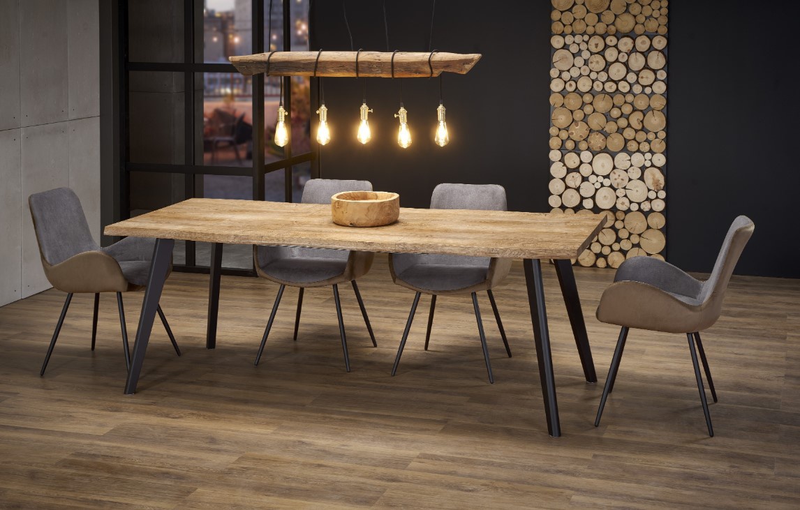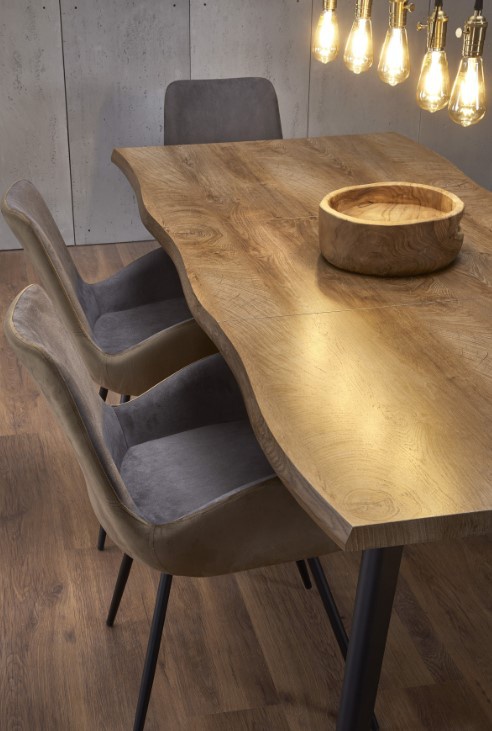 Rozkládací jídelní stůl je vyroben, deska stolu z odýhované MDF v barvě dub přírodní, nohy jsou z práškované oceli v barvě černé. Deska stolu má zajímavý zvlněný design. Židle nejsou součástí stolu. Zboží je dodáváno v demontu.