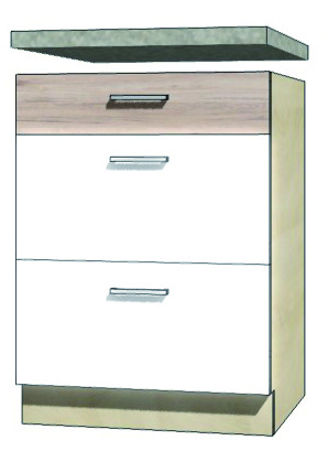 Třízásuvková dolní skříňka je vyrobena z laminované dřevotřísky v barevném provedení: korpus dub sonoma, dvířka san remo/bílá PVC. Dovírání v zásuvkách i dveřích je s funkcí tichého dovírání. Dolní skříňky jsou bez pracovní desky a soklu. Zboží dodáváme v demontu.