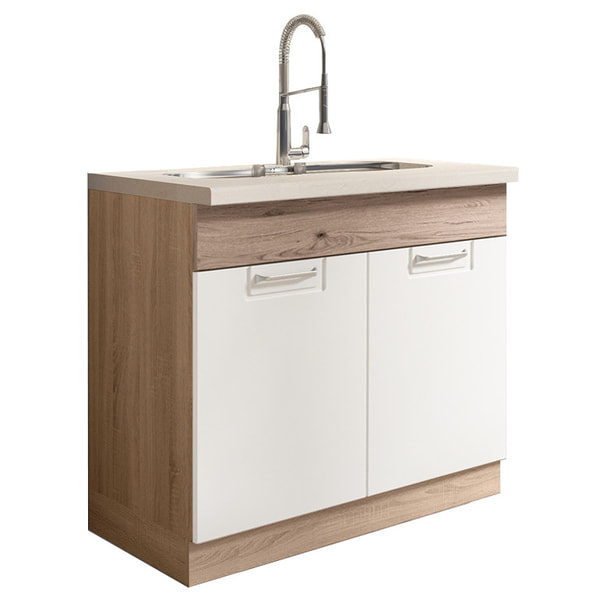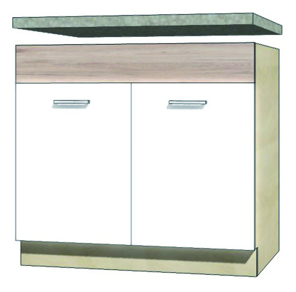 Dvoudvéřová dolní skříňka je vyrobena z laminované dřevotřísky v barevném provedení: korpus dub sonoma, dvířka san remo/bílá PVC. Dovírání v zásuvkách i dveřích je s funkcí tichého dovírání. Dolní skříňky jsou bez pracovní desky a soklu. Zboží dodáváme v demontu.