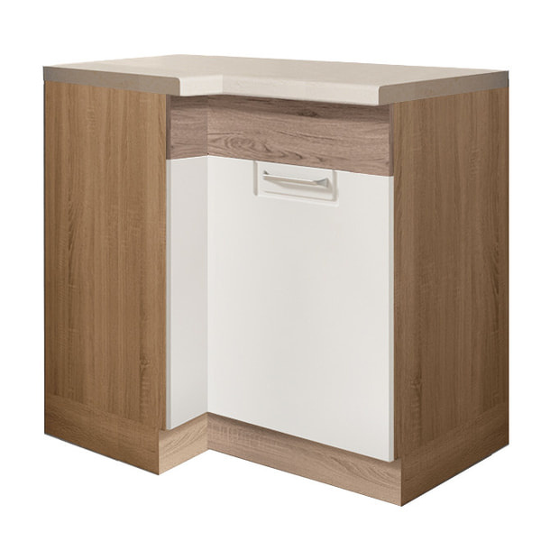 Rohová dolní skříňka je vyrobena z laminované dřevotřísky v barevném provedení: korpus dub sonoma, dvířka san remo/bílá PVC. Dovírání v zásuvkách i dveřích je s funkcí tichého dovírání. Dolní skříňky jsou bez pracovní desky a soklu. Zboží dodáváme v demontu.