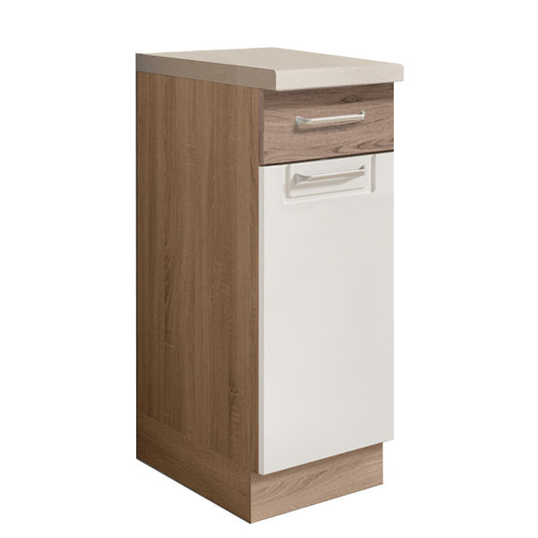 Jednodvéřová dolní skříňka se zásuvkou vč. police je vyrobena z laminované dřevotřísky v barevném provedení: korpus dub sonoma, dvířka san remo/bílá PVC. Dovírání v zásuvkách i dveřích je s funkcí tichého dovírání. Dolní skříňky jsou bez pracovní desky a soklu. Zboží dodáváme v demontu.