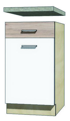 Jednodvéřová dolní skříňka se zásuvkou vč. police je vyrobena z laminované dřevotřísky v barevném provedení: korpus dub sonoma, dvířka san remo/bílá PVC. Dovírání v zásuvkách i dveřích je s funkcí tichého dovírání. Dolní skříňky jsou bez pracovní desky a soklu. Zboží dodáváme v demontu.