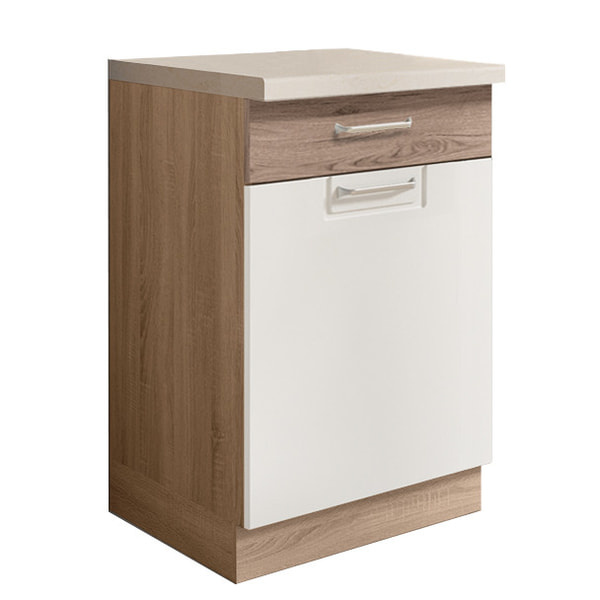 Jednodvéřová dolní skříňka se zásuvkou vč. police je vyrobena z laminované dřevotřísky v barevném provedení: korpus dub sonoma, dvířka san remo/bílá PVC. Dovírání v zásuvkách i dveřích je s funkcí tichého dovírání. Dolní skříňky jsou bez pracovní desky a soklu. Zboží dodáváme v demontu.