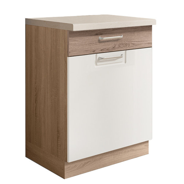 Jednodvéřová dolní skříňka se zásuvkou vč. police je vyrobena z laminované dřevotřísky v barevném provedení: korpus dub sonoma, dvířka san remo/bílá PVC. Dovírání v zásuvkách i dveřích je s funkcí tichého dovírání. Dolní skříňky jsou bez pracovní desky a soklu. Zboží dodáváme v demontu.
