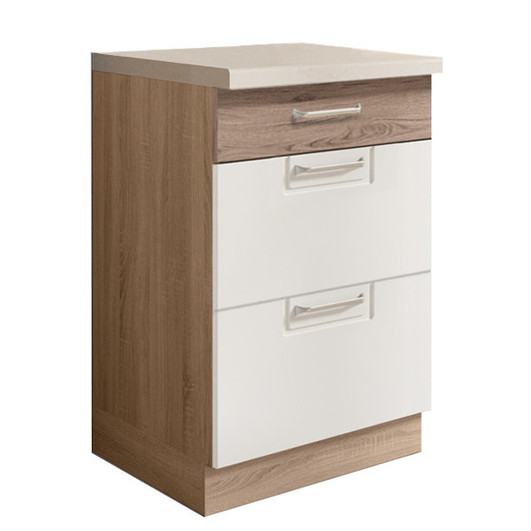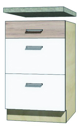 Třízásuvková dolní skříňka je vyrobena z laminované dřevotřísky v barevném provedení: korpus dub sonoma, dvířka san remo/bílá PVC. Dovírání v zásuvkách i dveřích je s funkcí tichého dovírání. Dolní skříňky jsou bez pracovní desky a soklu. Zboží dodáváme v demontu.