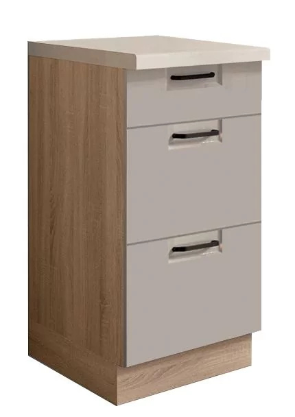Praktická tří-zásuvková dolní skříňka je vyrobena z laminované dřevotřísky v barevném provedení korpus dub sonoma, dvířka šedý lesk. Skříně s tichým dovíráním v zásuvkách a dvířkách. Výhodou systému Favorit je možnost libovolného sestavení skříněk a díky tomu můžete tvořit vybrané kompozice a přizpůsobit je vlastním interiérům. Dolní skříňky jsou bez pracovní desky a soklu. Zboží dodáváme v demontu.