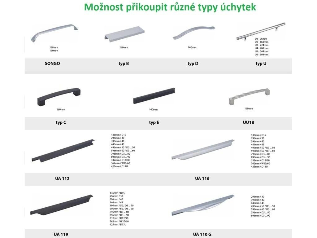 korpus WHITE - kvalitní závěsy GRASS HOPPER se systémem tichého dovíraní dvířek - tlumiče jsou integrovány v kování (tiché dovíraní se nevztahuje na rohové a zásuvkové skříňky - to lze přiobjednat)