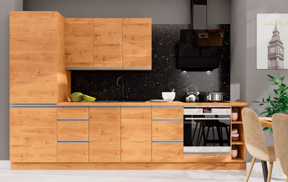 Dolní skříňka je vyrobena z lamina o tl. 16 mm v provedení dub soma tmavý. Ve skříňce je použito kování s tichým dojezdem. Úchytky a nožky jsou v barvě chromu. Skříňky obsahují návod k sestavení. Cena je bez soklu a pracovní desky- nutno objednat zvlášť. Zboží dodáváme v demontu.