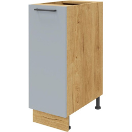 Dolní skříňka je vyrobena z lamina V provedení korpus dub soma tmavý o tl. 16mm, dvířka MDF šedé. Ve skříňce je použito kování s tichým dojezdem. Nožky jsou v barvě chromu. Cena je včetně kovového cargo koše. Skříňky obsahují kompletní kování, úchytky a návod k sestavení. Cena je bez soklu a pracovní desky- nutno objednat zvlášť. Zboží dodáváme v demontu.