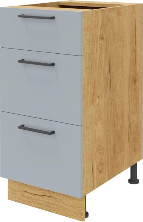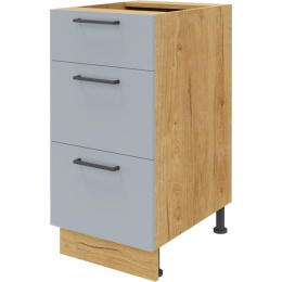 Dolní skříňka je vyrobena z lamina V provedení korpus dub soma tmavý o tl. 16mm, čela šuplíků MDF šedé. Ve skříňce je použito kování s tichým dojezdem. Nožky jsou v barvě chromu. Cena včetně praktické zásuvkové vložky na příbory. Skříňky obsahují kompletní kování, úchytky a návod k sestavení. Cena je bez soklu a pracovní desky- nutno objednat zvlášť. Zboží dodáváme v demontu.