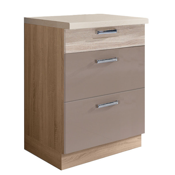 Praktická třízásuvková dolní skříňka je vyrobena z laminované dřevotřísky v barevném provedení dub sonoma/cappuccino lesk. Skříně s tichým dovíráním v zásuvkách a dvířkách. Výhodou systému Premio je možnost libovolného sestavení skříněk a díky tomu můžete tvořit vybrané kompozice a přizpůsobit je vlastním interiérům. Dolní skříňky jsou bez pracovní desky a soklu. Zboží dodáváme v demontu..