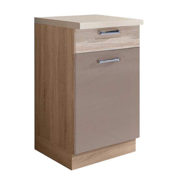 Praktická jednodvéřová dolní skříňka se zásuvkou je vyrobena z laminované dřevotřísky v barevném provedení  dub sonoma/cappuccino lesk. Díky polici uvnitř skříně získáte praktický úložný prostor. Skříně s tichým dovíráním v zásuvkách a dvířkách. Výhodou systému Premio je možnost libovolného sestavení skříněk a díky tomu můžete tvořit vybrané kompozice a přizpůsobit je vlastním interiérům. Dolní skříňky jsou bez pracovní desky a soklu. Zboží dodáváme v demontu.
