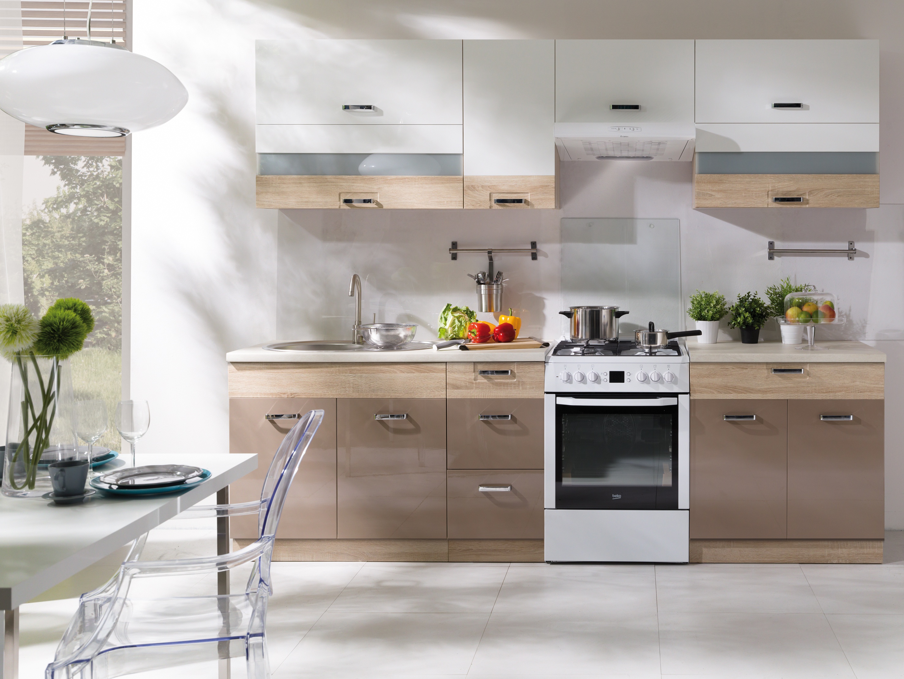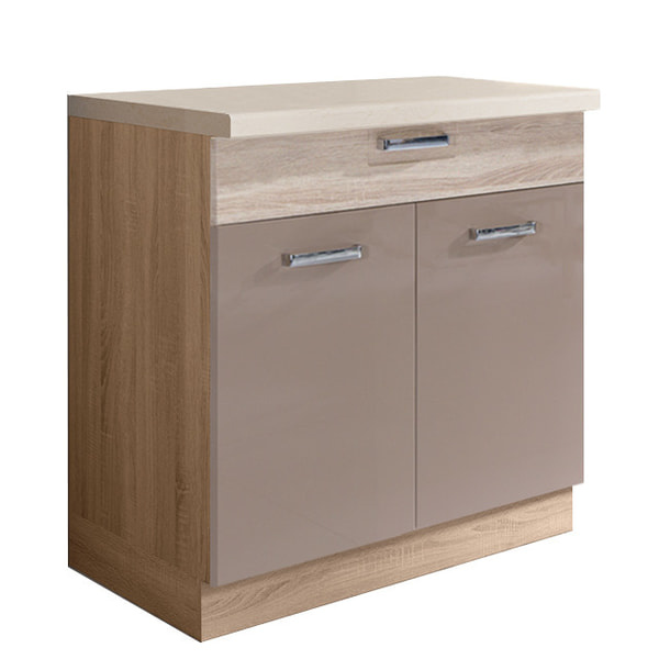Praktická dvoudvéřová dolní skříňka se zásuvkou je vyrobena z laminované dřevotřísky v barevném provedení  dub sonoma/cappuccino lesk. Díky polici uvnitř skříně získáte praktický úložný prostor. Skříně s tichým dovíráním v zásuvkách a dvířkách. Výhodou systému Premio je možnost libovolného sestavení skříněk a díky tomu můžete tvořit vybrané kompozice a přizpůsobit je vlastním interiérům. Dolní skříňky jsou bez pracovní desky a soklu. Zboží dodáváme v demontu.